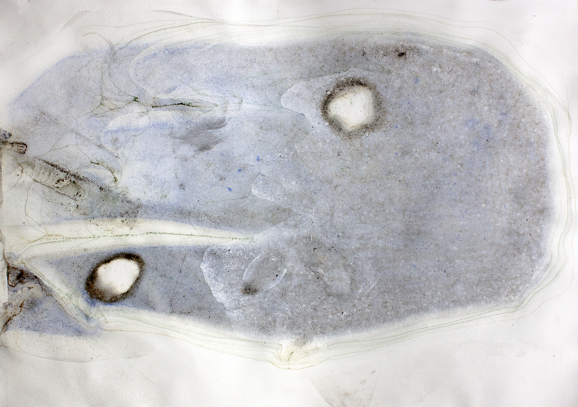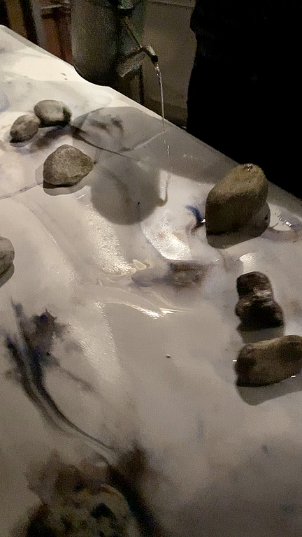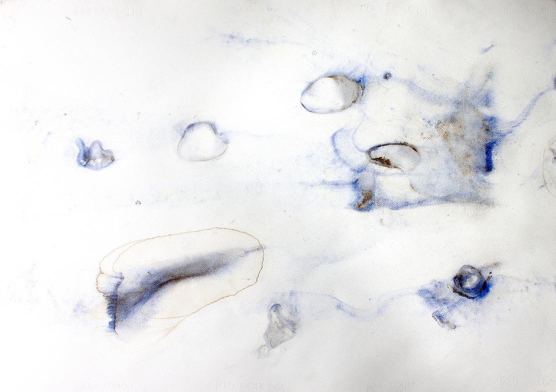 After observing the movement of water across the three sheets, the existing streams were guided and worked with coloured pigment, allowing the pigment to flow through all three surfaces. Part of the pigment became trapped within the irregularities created by the deformations of the paper and the presence of the stones, while most of it continued its path, flowing into the final pool of water collected within the third sheet, positioned on the horizontal, non-inclined plane.