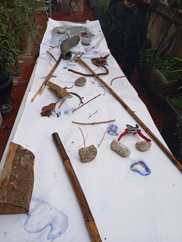 Once the drying process is complete, the work is examined to assess whether the initial method was sufficient and whether the composition functions as intended. In this case, it involved the addition of natural elements such as branches and bamboo canes, along with industrial materials found in the surrounding environment.