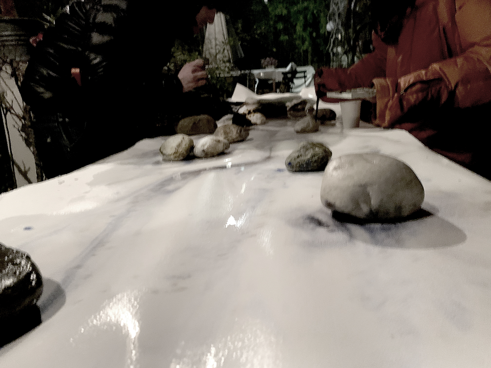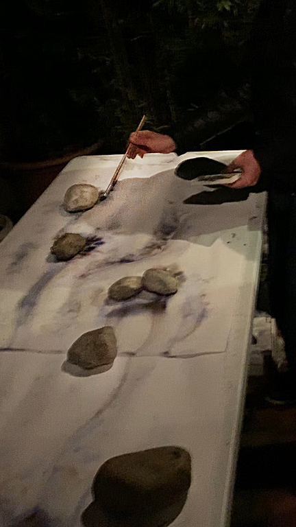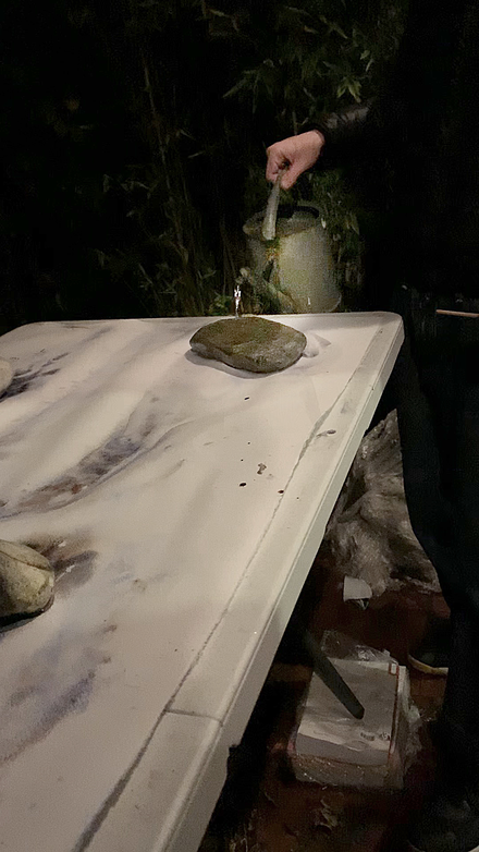 A method was developed that begins with the intervention of the artist and continues through the action of natural agents. This relative loss of control and intentionality allows the work to open itself to collaboration with other artists, who position the stones and pour the water mixed with pigment onto the surface.