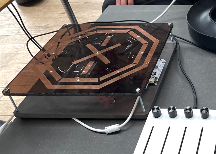 The interface was rebuilt on a translucent acrylic plate, elevating the durability and aesthetics of the build. The copper tape design remained on the surface, with internal wiring neatly arranged and visible beneath the plate. The plate is mounted on bolts, elevating it from the base and making the construction both functional and visually expressive, emphasizing the technical and symbolic layers of the interface.