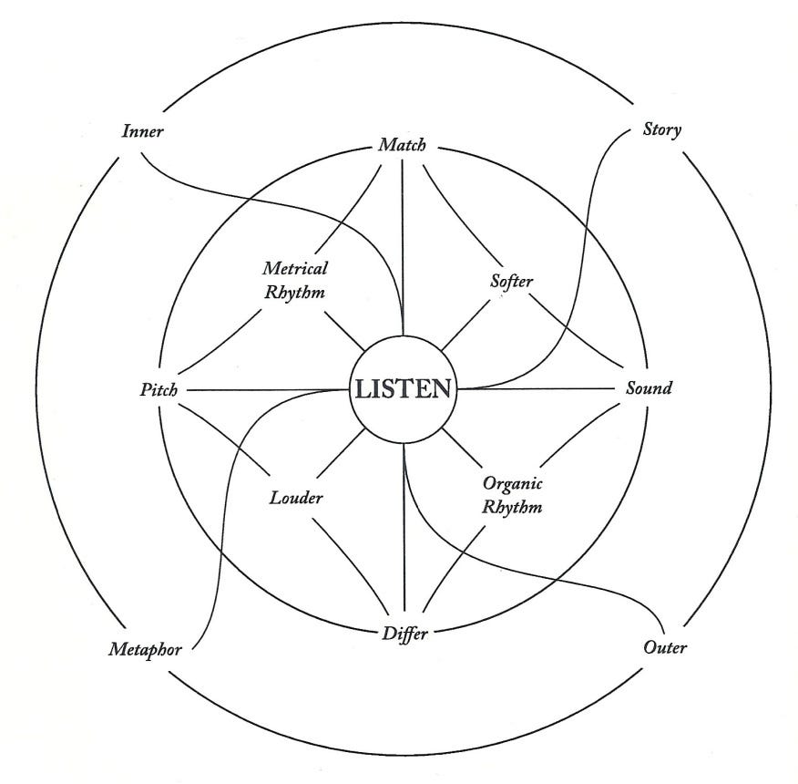 We were also inspired by Pauline Oliveros’ listening score Wind Horse, particularly its use of circular form and the distribution of sonic elements in space. This helped guide the conceptual placement of instrument groups across the Bagua layout. (source)