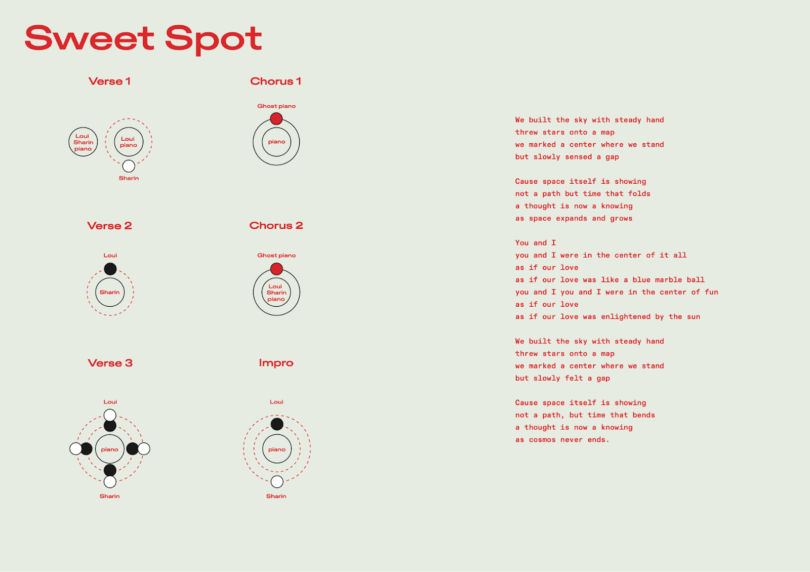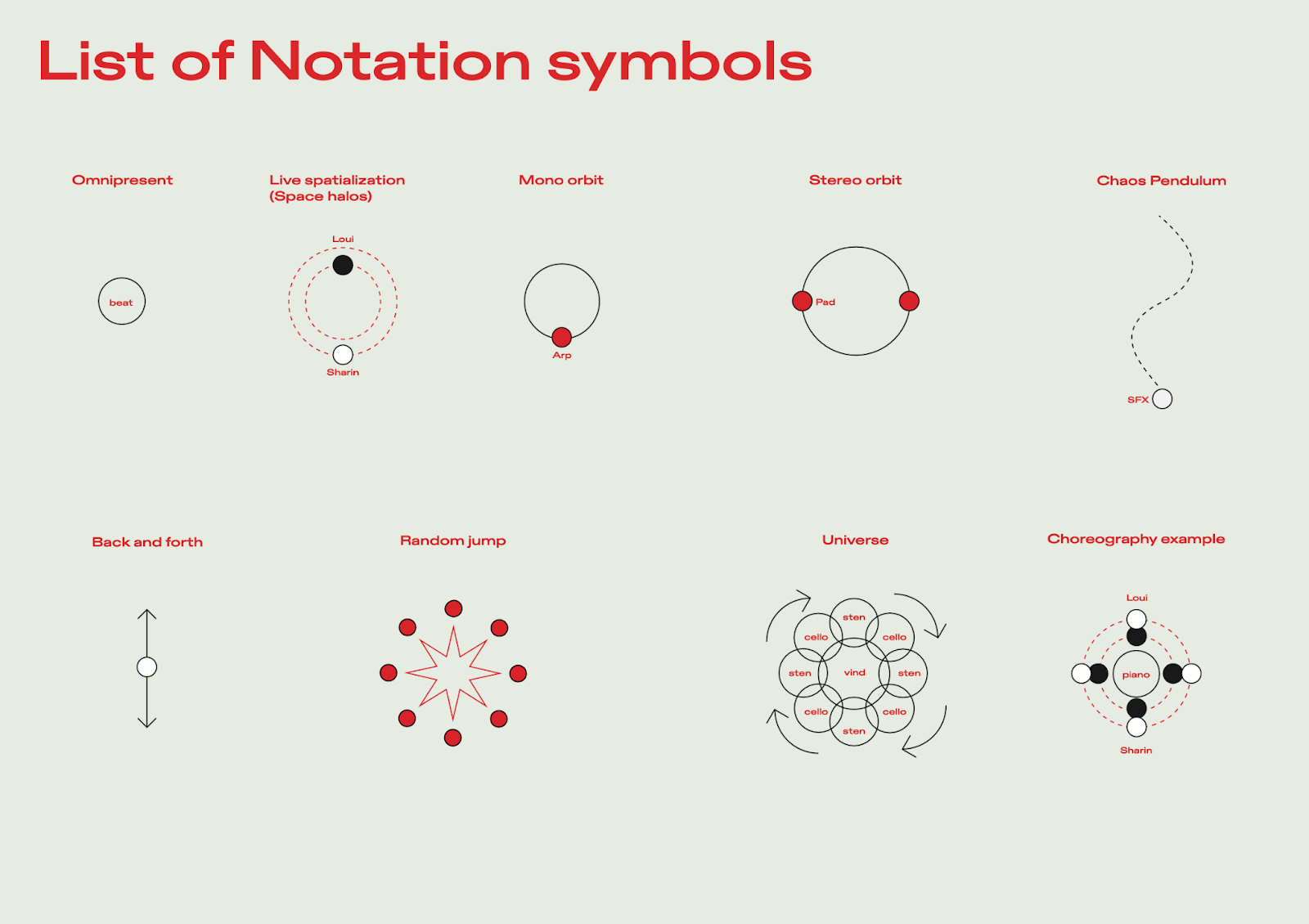 After an iterative process, we have arrived at a notation system that we use to map spatial arrangements and strategies for our songs (find more examples of songs in their final version in the Spatial Scores section). While working on the song Sweet Spot, the notation system prompted conceptualizing spatial ideas and choreography visually before implementing them sonically.