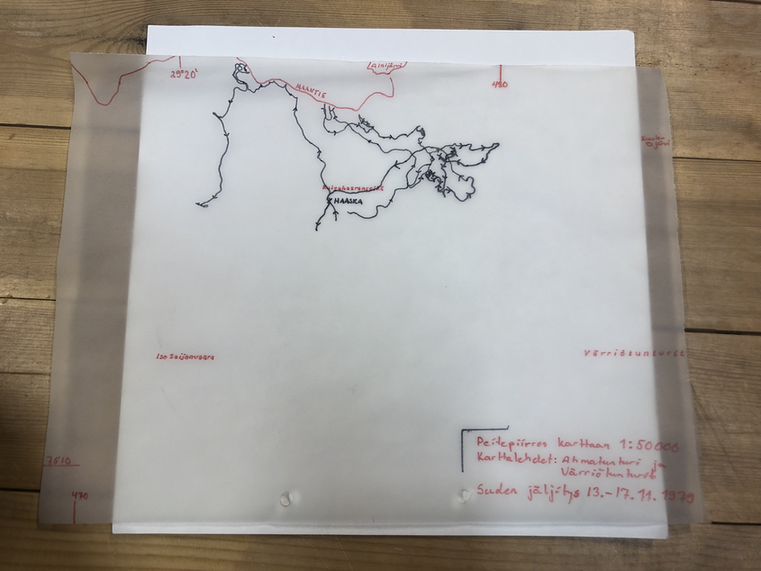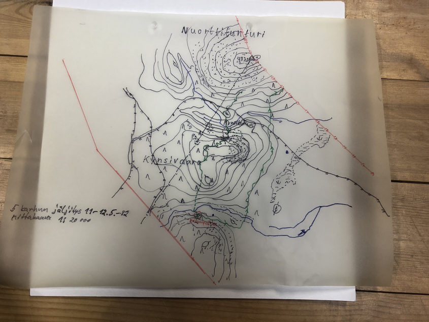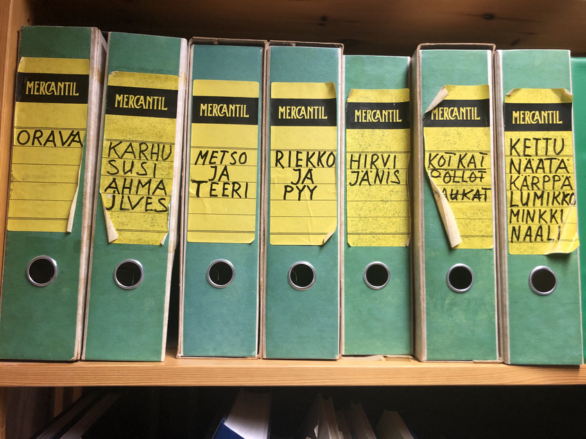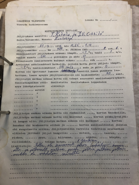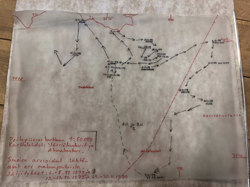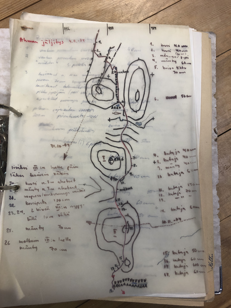 Petoeläinten reittejä kuvaavat käsin piirretyt ja kirjoitetut muistiinpanot tutkimusaseman kirjaston mapeissa (arkistoitu aineisto).