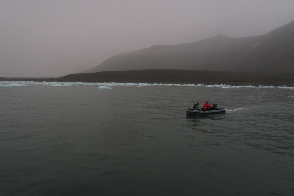 ajo zodiakilla kelluvien jäiden läpi Horyzont tutkimusalukselta aseman rantaan