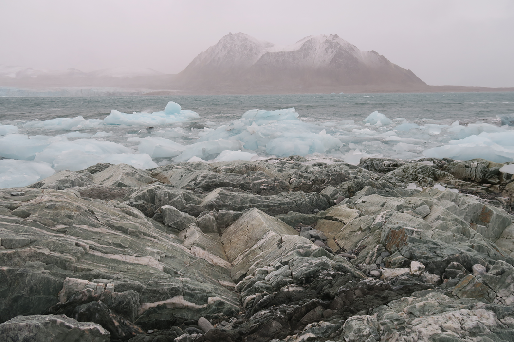 Maisema etäältä; vuoret, tundra, meressä kelluva jää, jäätikkö ja meri.