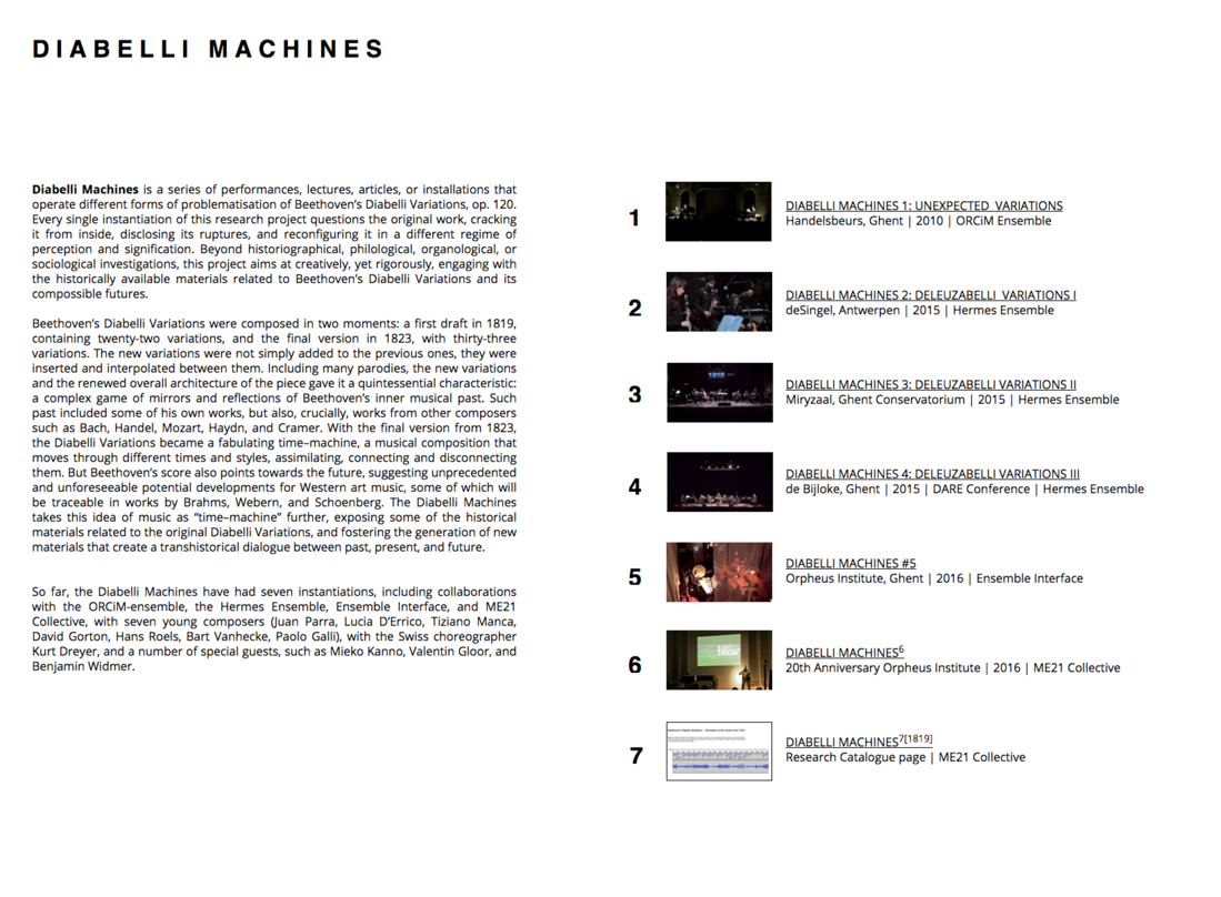 MusicExperiment21 (ME21) is a five-year artistic research programme (2013-2018), funded by the European Research Council and based at the Orpheus Institute, in Ghent (BE). The project explores and develops notions of “experimentation” in order to challenge dominant performance practices of Western notated art music. It brings together different artistic, historical, methodological, epistemological, and philosophical approaches that contribute to a new experimental attitude, crucially moving from interpretation towards experimentation—a central term that is not used in relation to measurable phenomena, but rather to a willingness to constantly reshape thoughts and practices, to contribute to new redistributions of the sensible, particularly affording unpredictable reconfigurations of music.