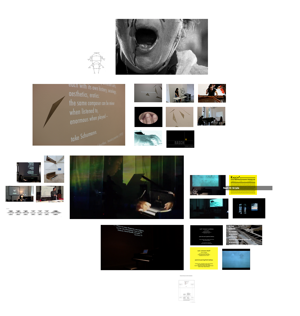 A first example was already presented above. Con Luigi Nono—Unfolding Waves illustrates the modular model of doing and exposing research. As for the principles of “seriality” and “differential repetition” Rasch X is the perfect example. It consists of a potentially infinite series of mutational performances based upon two basic materials: Robert Schumann’s Kreisleriana op. 16 (1838), and Roland Barthes essays on the music of Schumann (1970, 1975, 1979), particularly ‘Rasch’, a piece of writing exclusively dedicated to Schumann’s Kreisleriana. To these materials other components may be added for every single particular version: visual elements (pictures, videos), other texts, or further aural elements (recordings, live-electronics, etc.). The main goal is to generate an intricate network of aesthetic-epistemic cross-references, through which the listener has the freedom to focus on different layers of perception: be it on the music, on the texts being projected or read, on the images, on the voices, etc. Situated beyond “interpretation”, “hermeneutics”, and “aesthetics” the twenty-four instantiations (so far) of Rasch X have been emblematic for what might be labelled as experimental performance practices. These practices productively deviate from conventional (repetitive) performative strategies transforming familiar artistic objects into objects for thought.