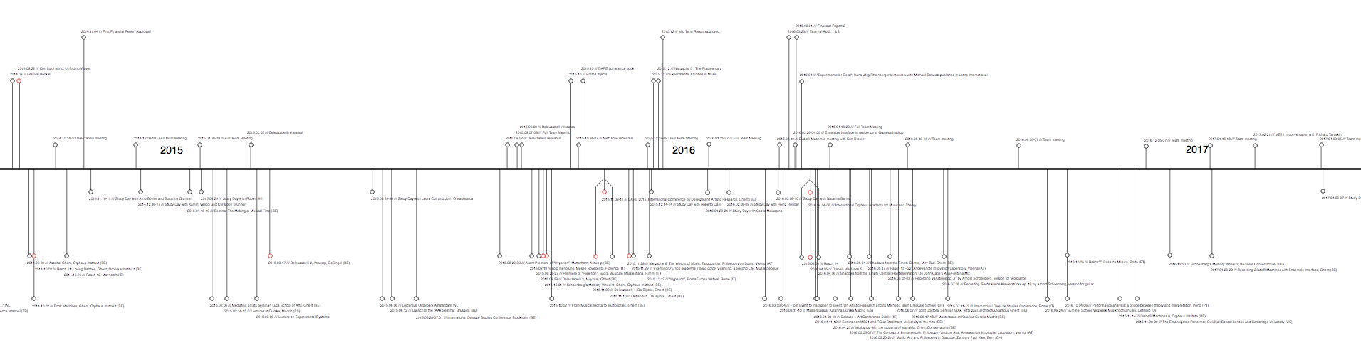 More concretely, MusicExperiment21 is generating new modes of music performance, innovative approaches to historical materials, and exploring new media for the exposition of artistic research in music. Inspired by Deleuze and Guattari’s discourse on strata (cf. Deleuze and Guattari 1987, 553-556), and remaining aware of the unavoidable anisomorphism between philosophy and art, one can identify six types of strata in those music materials that physically exist in the real world: parastrata (treatises, manuals, iconography, period instruments, descriptions of concerts, critics, archives, lists of personnel, payments, etc.), substrata (sketches, drafts, first editions, letters, writings by composers and performers, annotations, etc.); epistrata (period editions, editions throughout time, analysis, reflexive texts, theoretical contextualizations, recordings, etc.); metastrata (future performances, expositions, recordings, transcriptions, etc.), and allostrata (materials that not directly relating to a given work can enter productive relationships with it). In music, these strata are not only being added and superposed in a linear progression—they infiltrate or contaminate each other throughout time, generating interstrata: complex arrangements of forces and intensities. By focusing on these innumerable documents, ‘works’ are being considered as historically constructed conglomerates of things. In this sense, works can be seen as meta-assemblages, since all of their constitutive things are in themselves concrete machinic assemblages (editions, recordings, essays, performances, etc.).