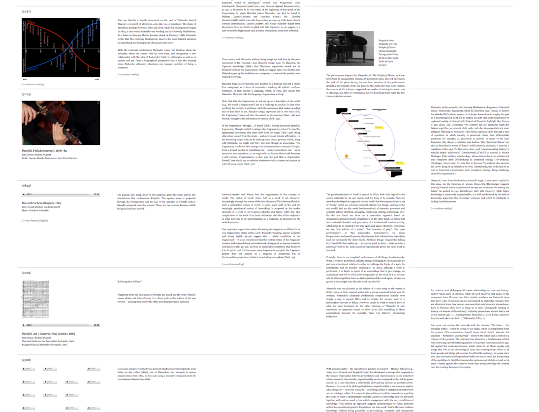 In relation to writing as a research practice it is worth mentioning another peer-reviewed publication done by MusicExperiment21 Nietzsche 5 : The Fragmentary (Schwab and De Assis, 2015, Ruukku 5), where writing is also experimental, yet with a completely different approach, enhancing the fragmentary character of the research object. Thus, ME21 is experimenting with context-situated solutions, looking for suitable formats and not aiming at developing solutions that could fit all case studies.