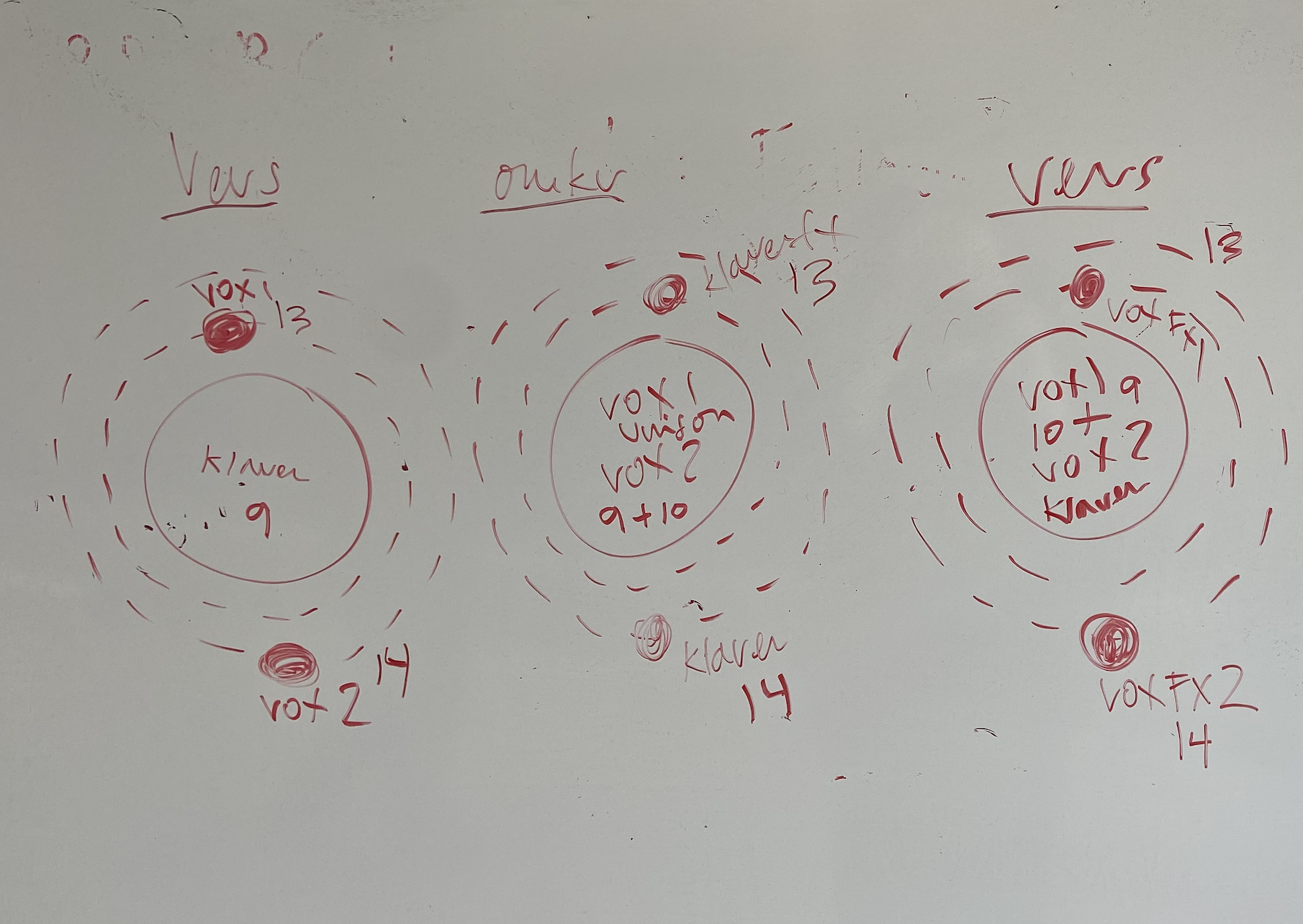 We have composed two primary melodies for the two voices, intending to explore their interplay through spatialization specifically for our Space Halo interfaces. This allowed us to dynamically shape and question the hierarchy and spatial relationship between them. In the chorus, the two melodies converge into a deliberately monotonous center, unmoving, repetitive, and in unison, while the harmony remains static, with chords that don’t progress but instead hover, unresolved. This sonic stasis mirrors the lyric: “You and I, you and I were in the center of it all”.