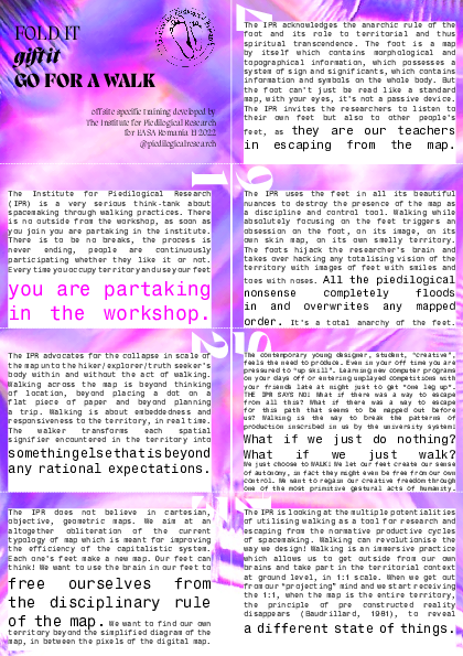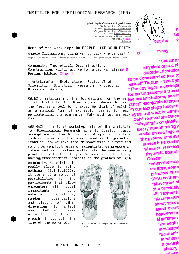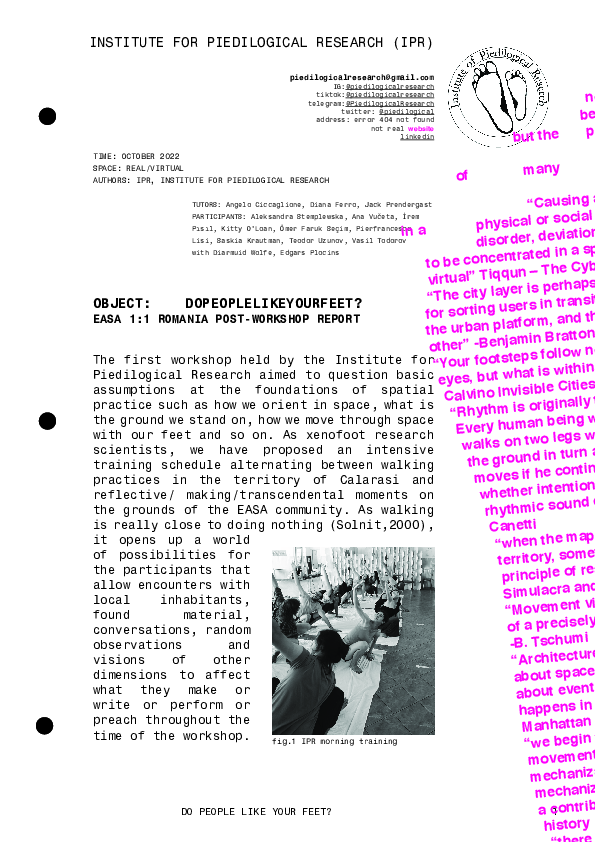 DoPeopleLikeYourFeet? The first workshop held by the Institute for Piedilogical Research aims to question basic assumptions at the foundations of spatial practice such as how we orient in space, what is the ground we stand on, how we move through space with our feet and so on. As xenofoot research scientists, we propose an intensive training schedule alternating between walking practices in the territory of Calarasi and reflective/ making/transcendental moments on the grounds of EASA community. As walking is really close to doing nothing (Solnit,2000), it opens up a world of possibilities for the participants that allow encounters with local inhabitants, found materials, conversations, random observations and visions of other dimensions to affect what they will make or write or perform or preach throughout the time of the workshop.