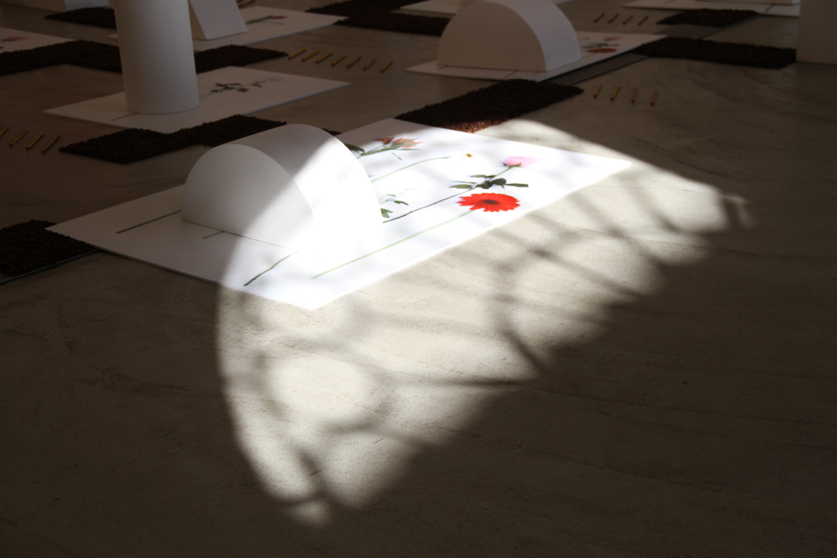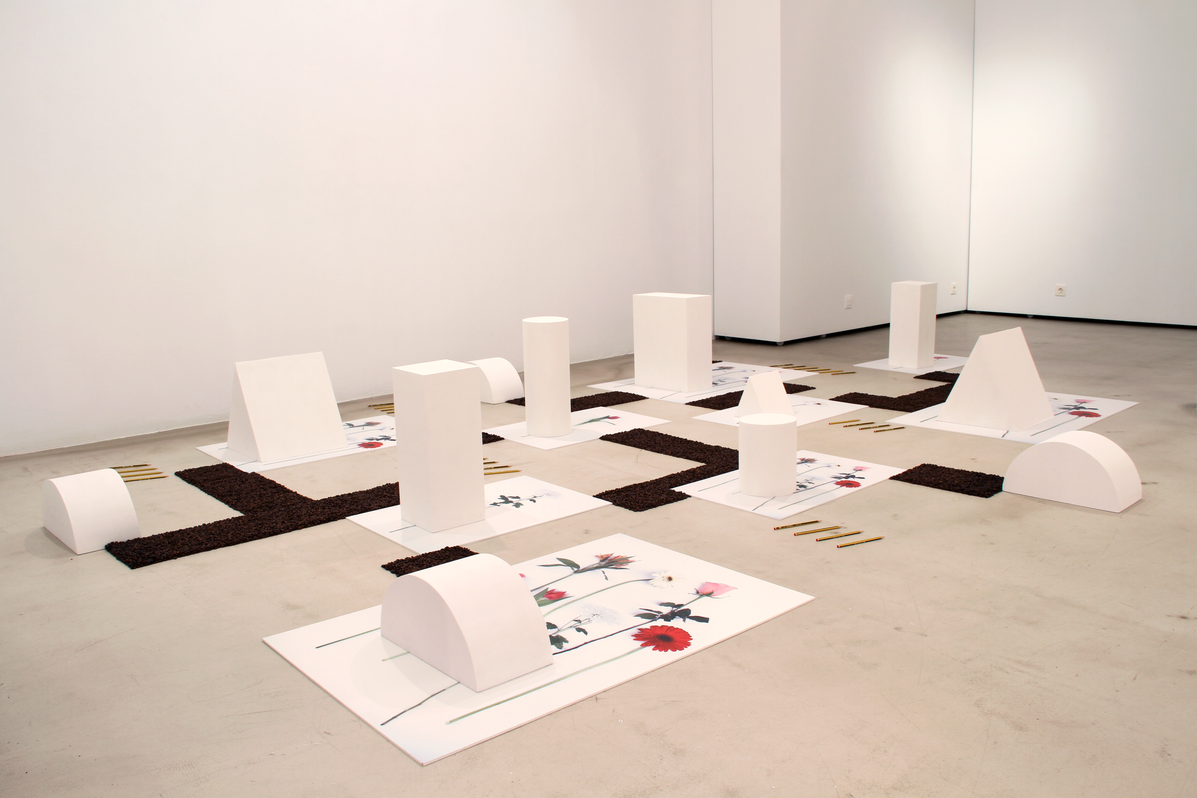 The geometric forms are cut out of foam rubber, a soft but resilient material that protects valued or new things. Here, it demands to be present, on flowers; it expands, or builds landscapes or still lives, depending on how you look at it. A relationship, a bond, is built through coffee grains and pencils. They are vulnerable forms of existence that propose everyday tensions and harmonies and give rise to new forms of action.
