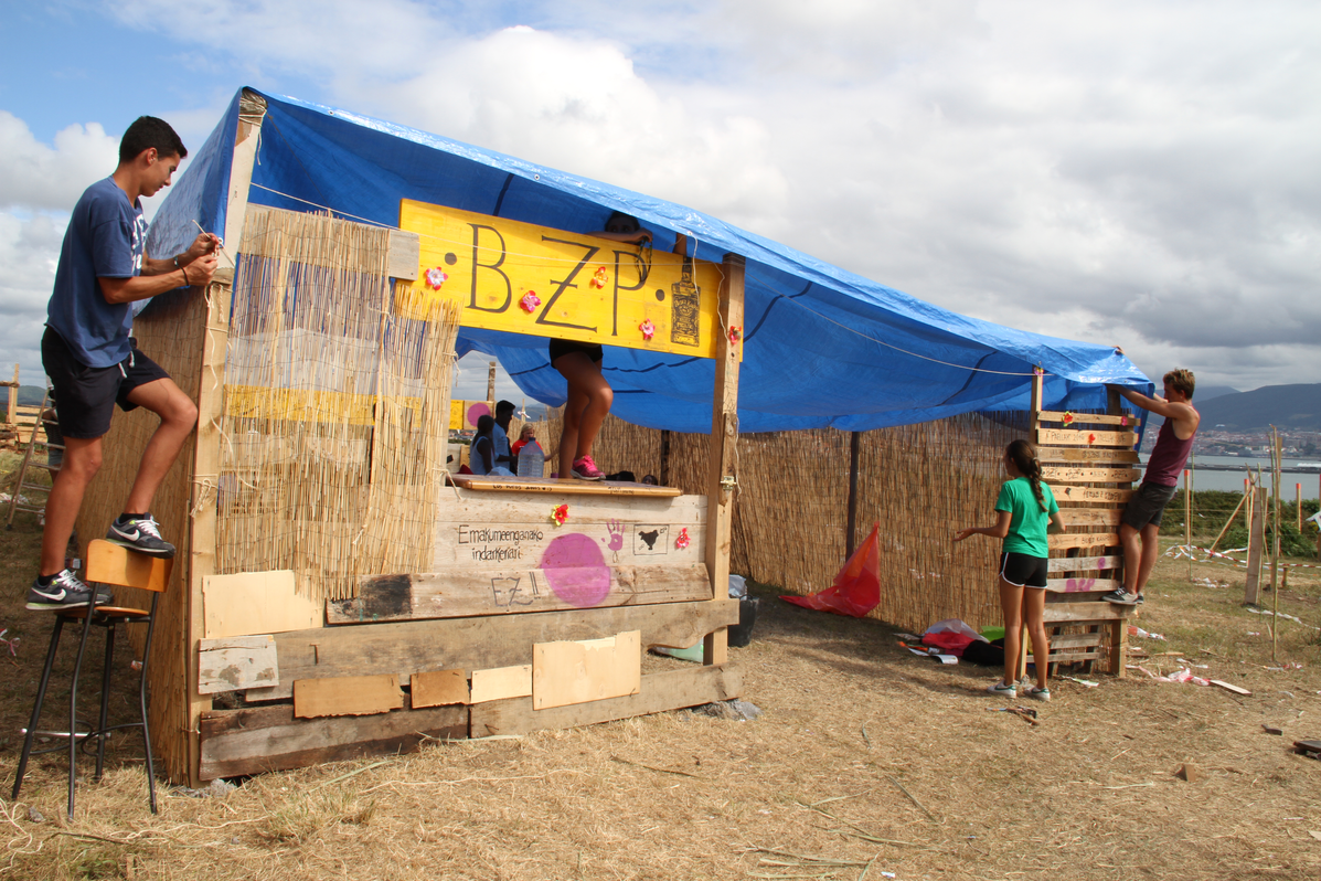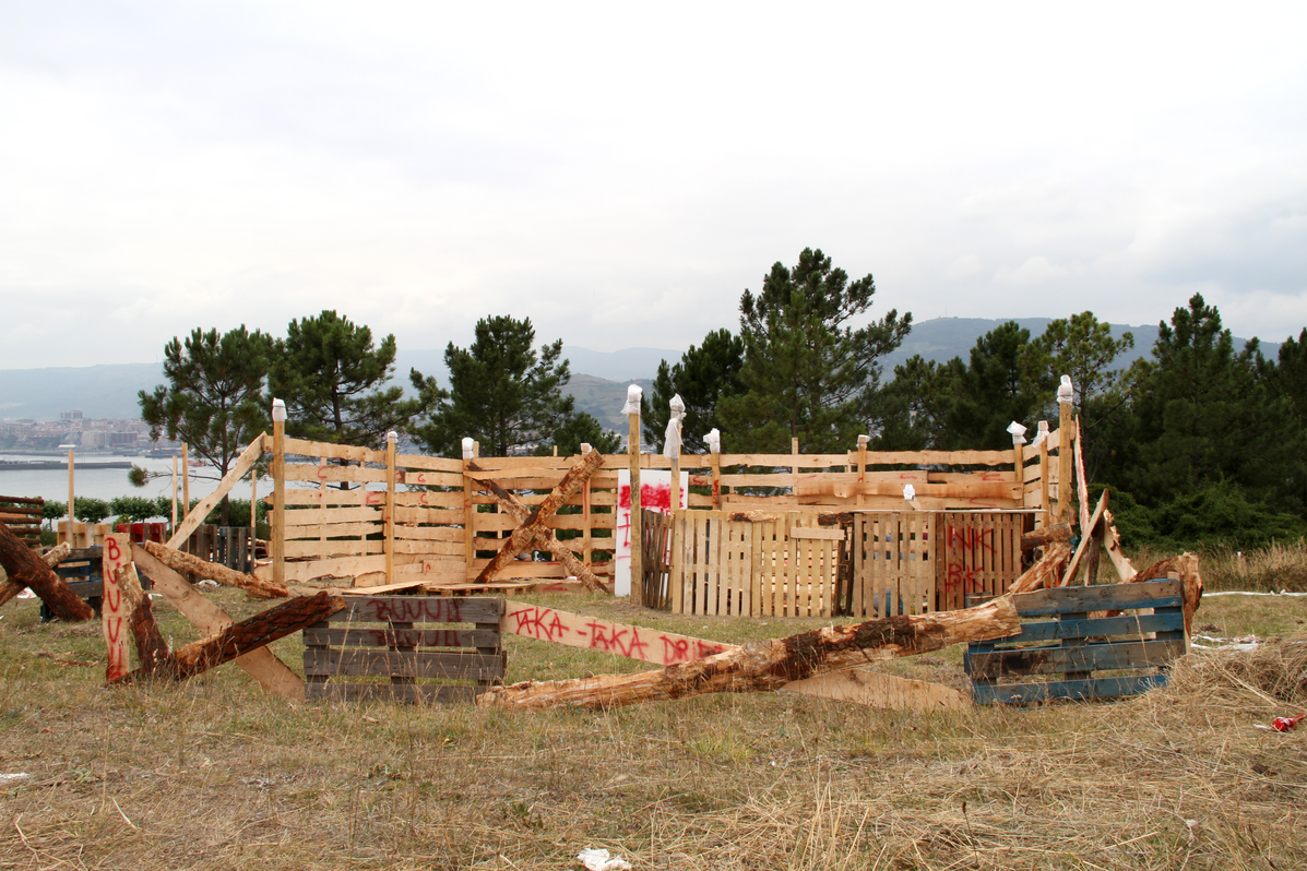 While the feast takes place in the area closest to the graveyard, groups of young people from Algorta and the surrounding areas set up an alternative, daytime celebration on the other side of the brambled hedges separating the fields of Aixerrota. As these groups have no space of their own and are not provided with any kind of shelter by the council, they build their own stands over the months of June and July and extend their territory to the edges of the pine forest near the cliffs.