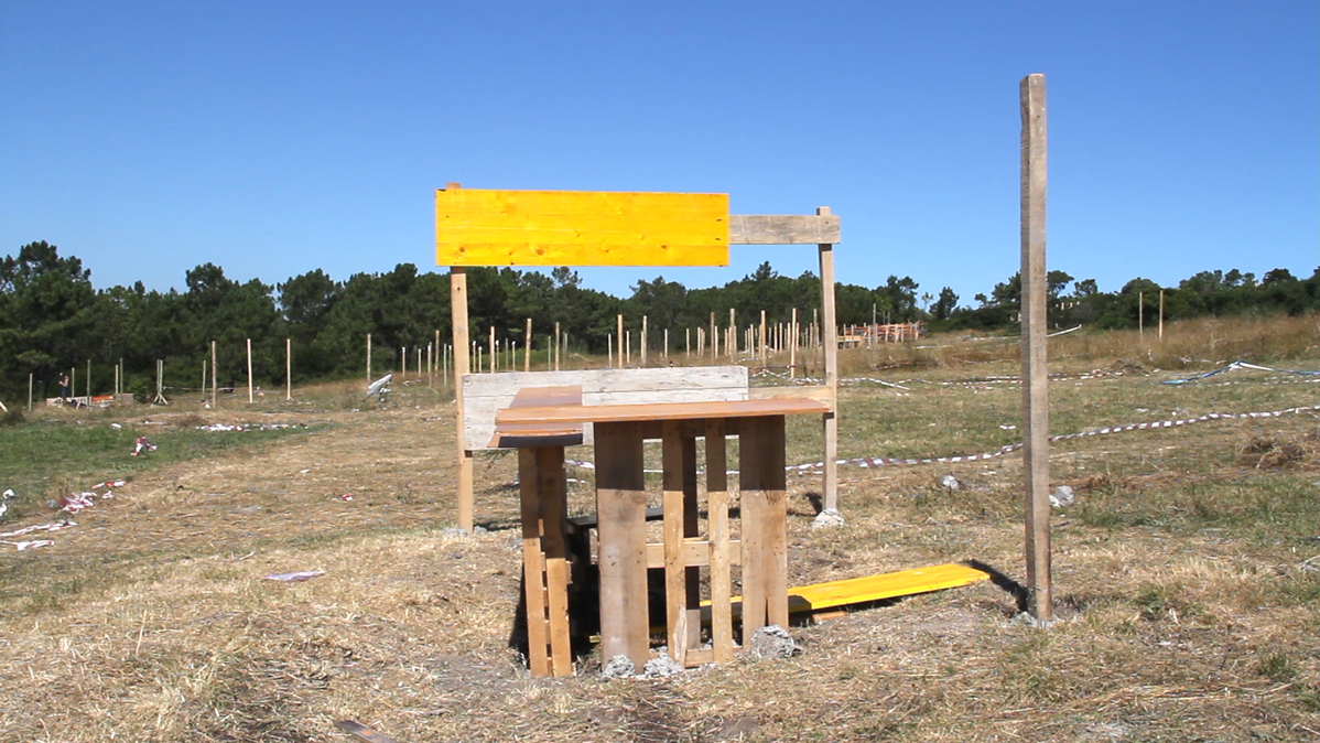 Many of the sequences in the audiovisual piece were filmed during the design and construction of the floor installation Gimnasio Esotérico (Esoteric Gymnastics), which was exhibited in summer 2016 at Bilbaoarte Foundation (Bilbao). The making of this piece forms part of the film. Its structure is inspired by the observation of the bowerbird’s folly and the stands at the paella feast.