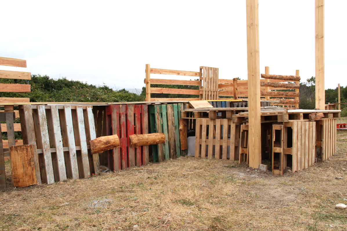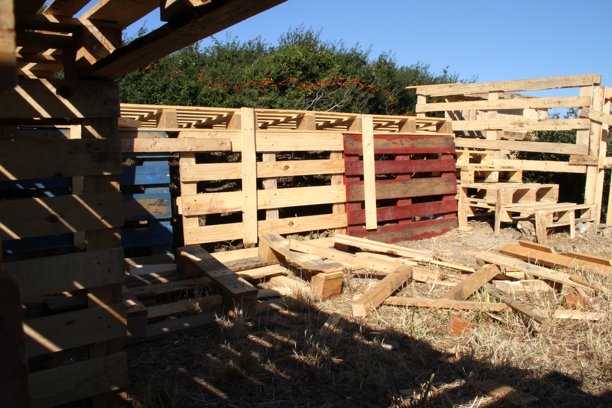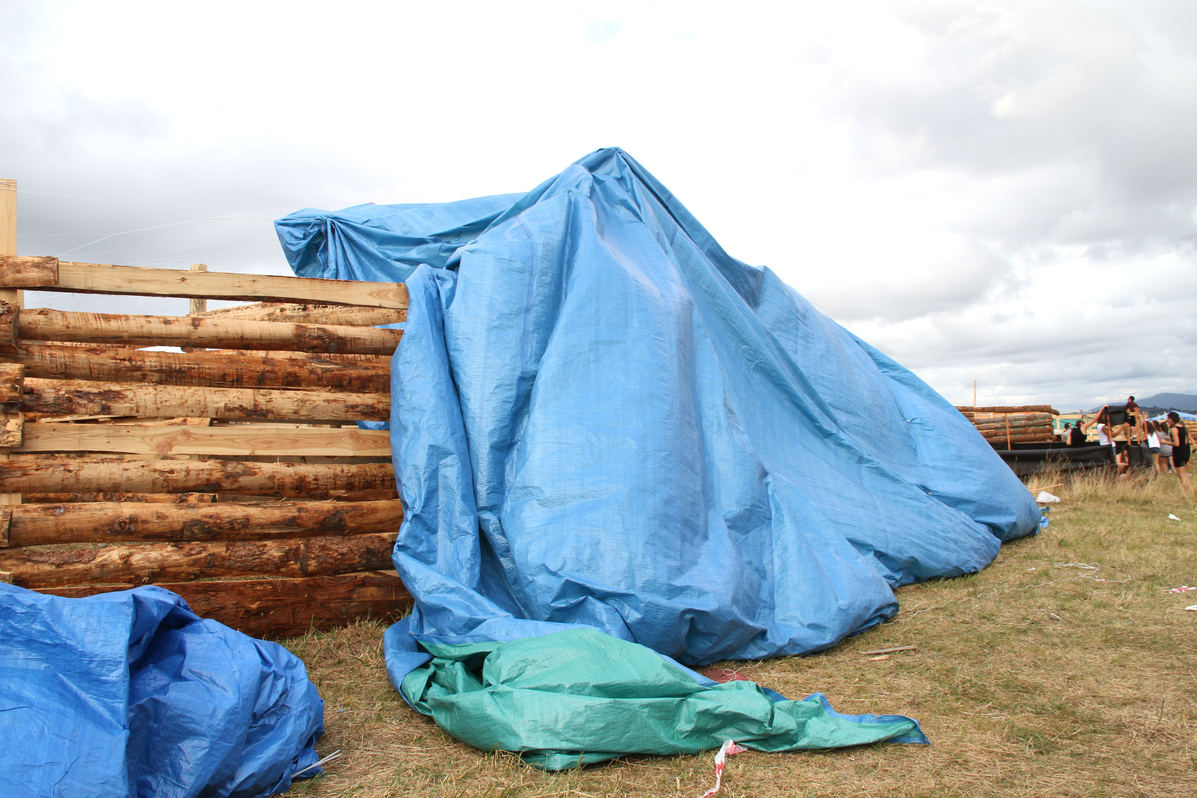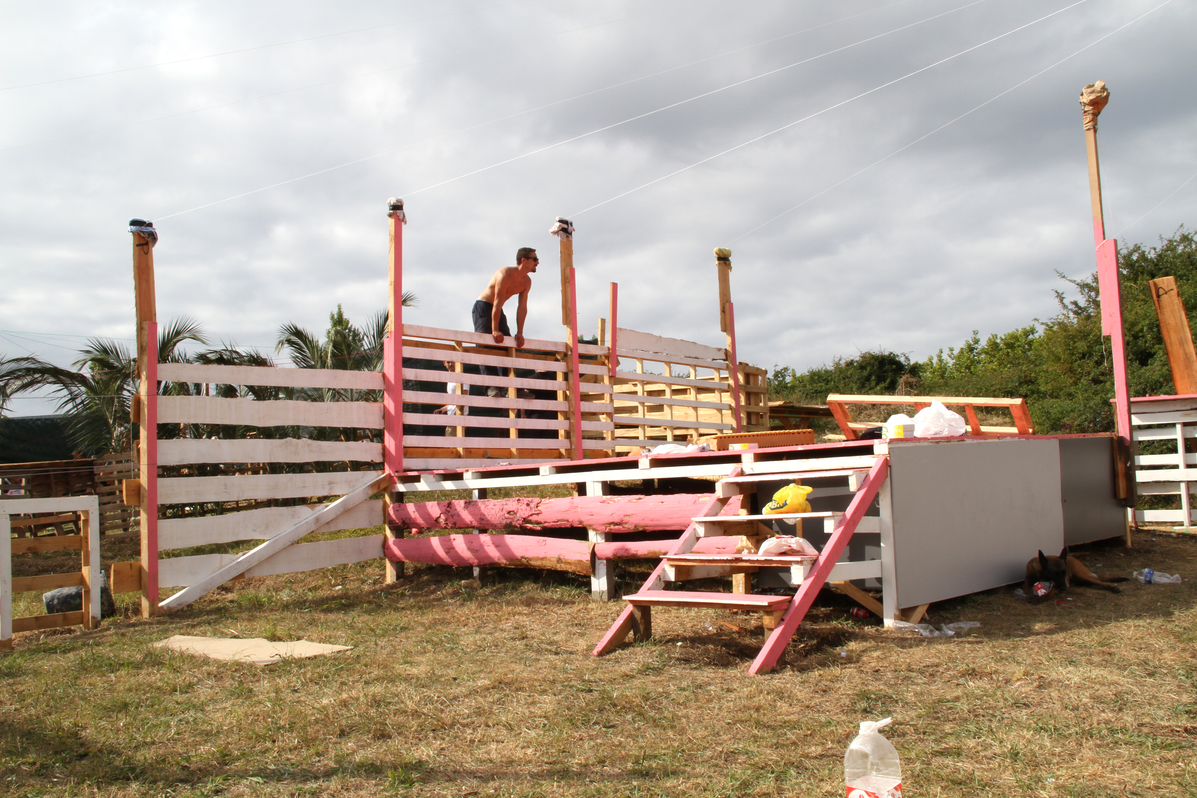 Building up. Building the stand is the hardest task when setting up the space. The simplest structure is typically a plastic gazebo, which comes with its own instructions. Some of these have plastic walls, others not. Sometimes grid-type walls are built using rope and ferns. Often the shelter is made out of building pallets, wooden rafters , and cork boarding. Once the main structure is built, furniture is brought in. The larger groups normally have a table and wooden benches. Sunshades are a regular feature. Mats are often used as beds. The stalls are very often decorated with flags, flowers, and even painted rafters or corner posts.