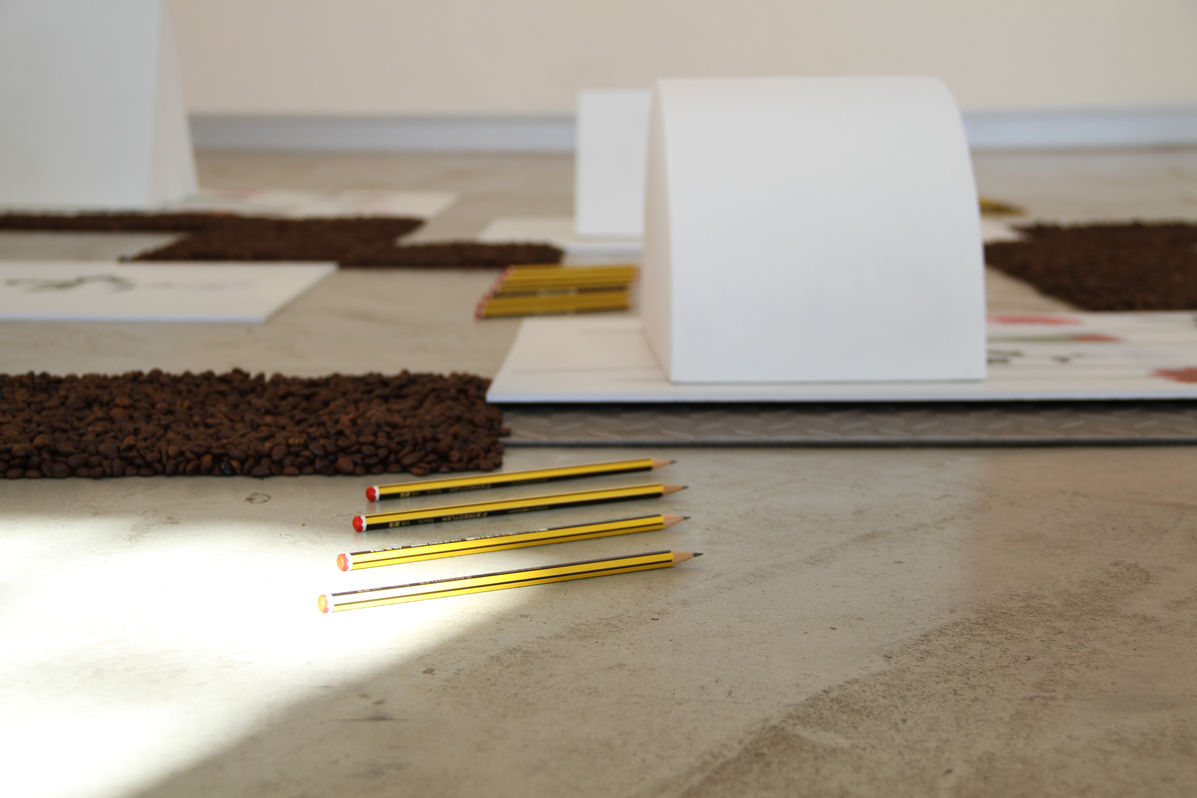 The geometric forms are cut out of foam rubber, a soft but resilient material that protects valued or new things. Here, it demands to be present, on flowers; it expands, or builds landscapes or still lives, depending on how you look at it. A relationship, a bond, is built through coffee grains and pencils. They are vulnerable forms of existence that propose everyday tensions and harmonies and give rise to new forms of action.