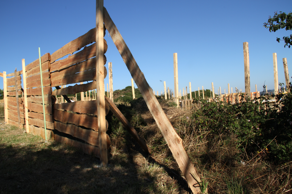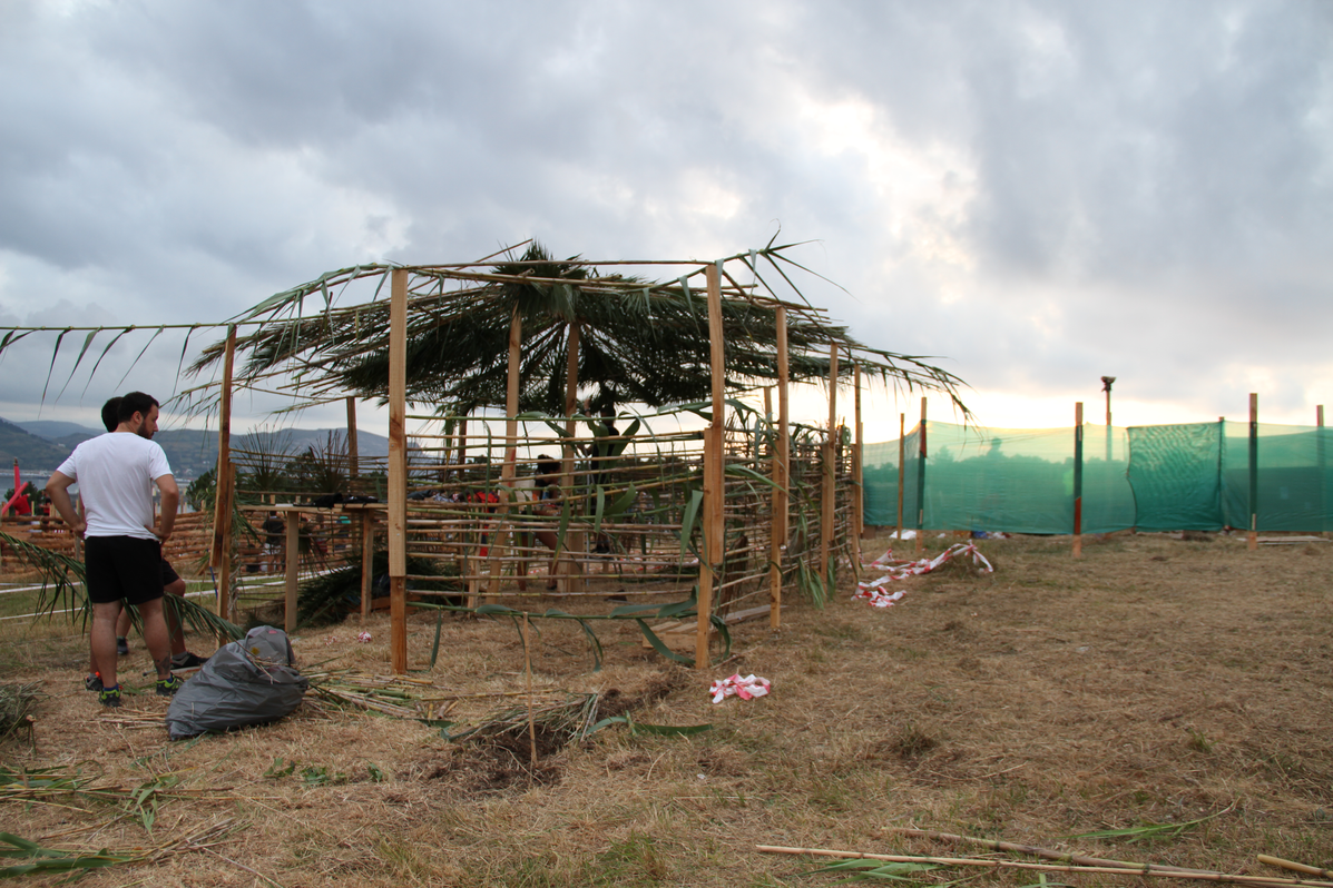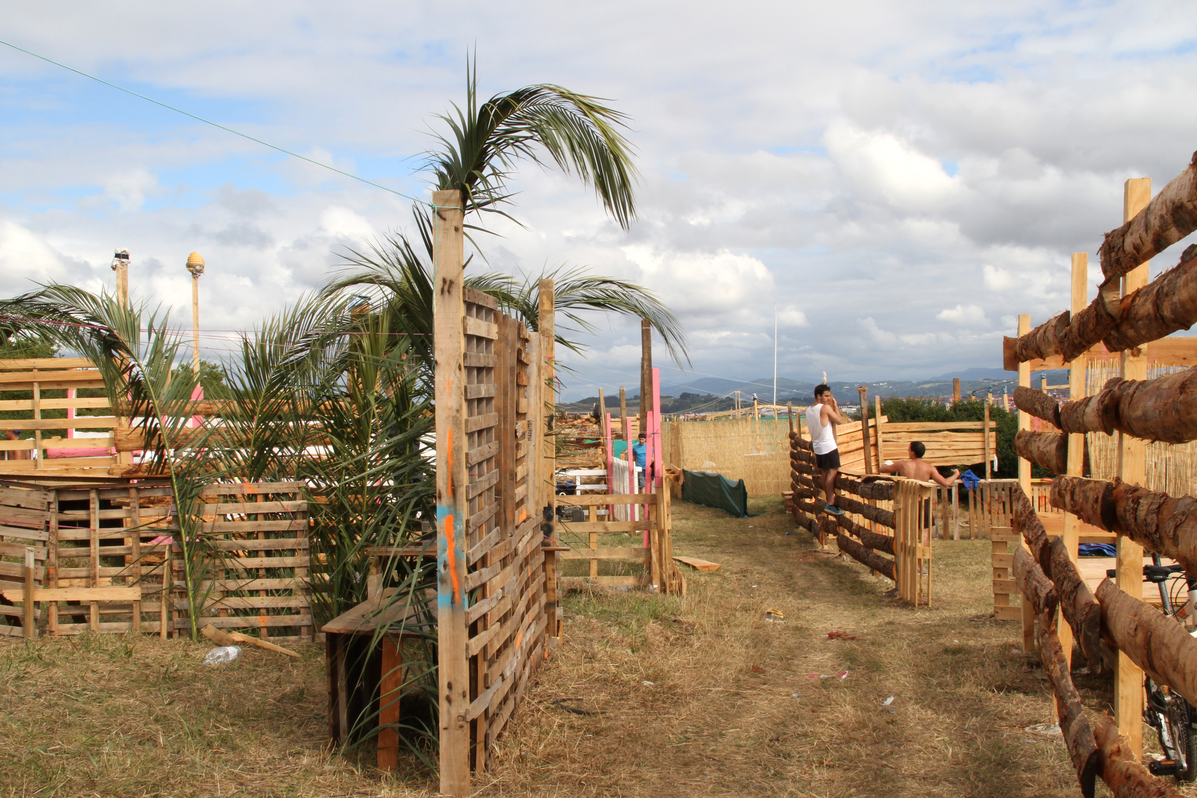While the feast takes place in the area closest to the graveyard, groups of young people from Algorta and the surrounding areas set up an alternative, daytime celebration on the other side of the brambled hedges separating the fields of Aixerrota. As these groups have no space of their own and are not provided with any kind of shelter by the council, they build their own stands over the months of June and July and extend their territory to the edges of the pine forest near the cliffs.