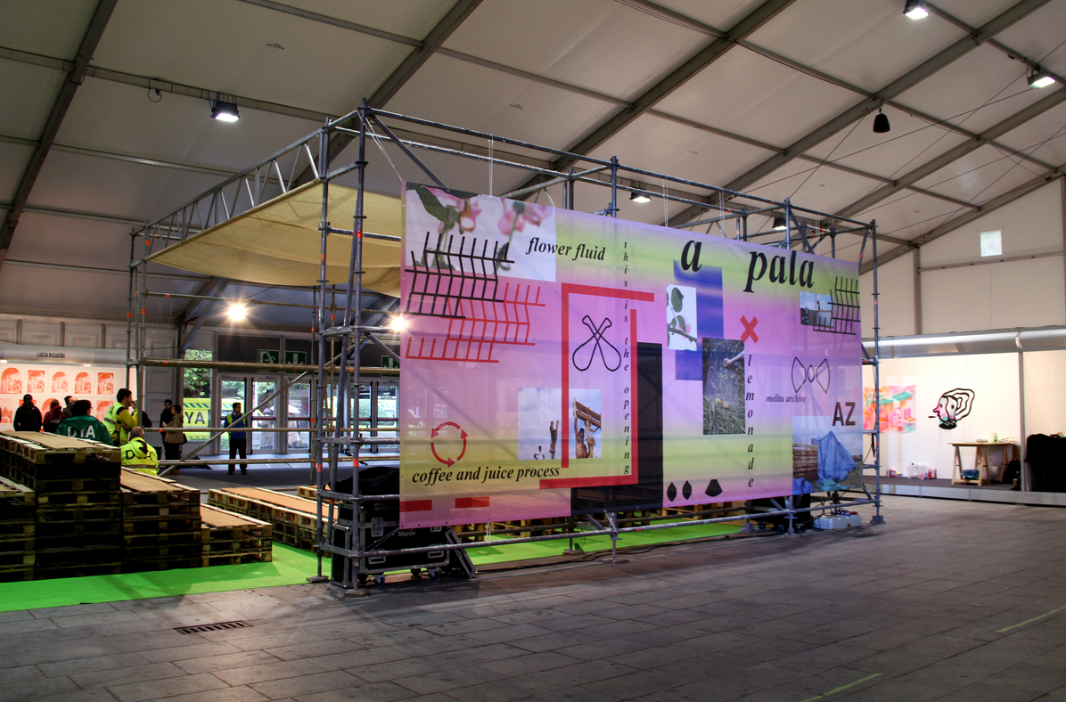 Many of the sequences in the audiovisual piece were filmed during the design and construction of the floor installation Gimnasio Esotérico (Esoteric Gymnastics), which was exhibited in summer 2016 at Bilbaoarte Foundation (Bilbao). The making of this piece forms part of the film. Its structure is inspired by the observation of the bowerbird’s folly and the stands at the paella feast.