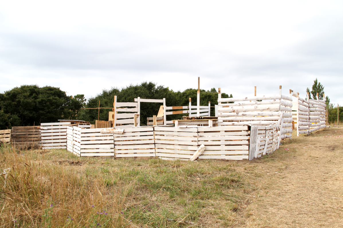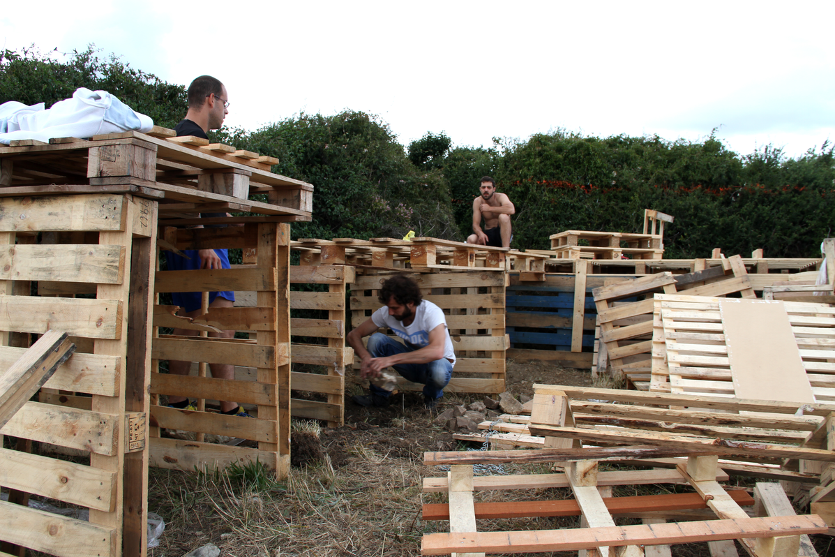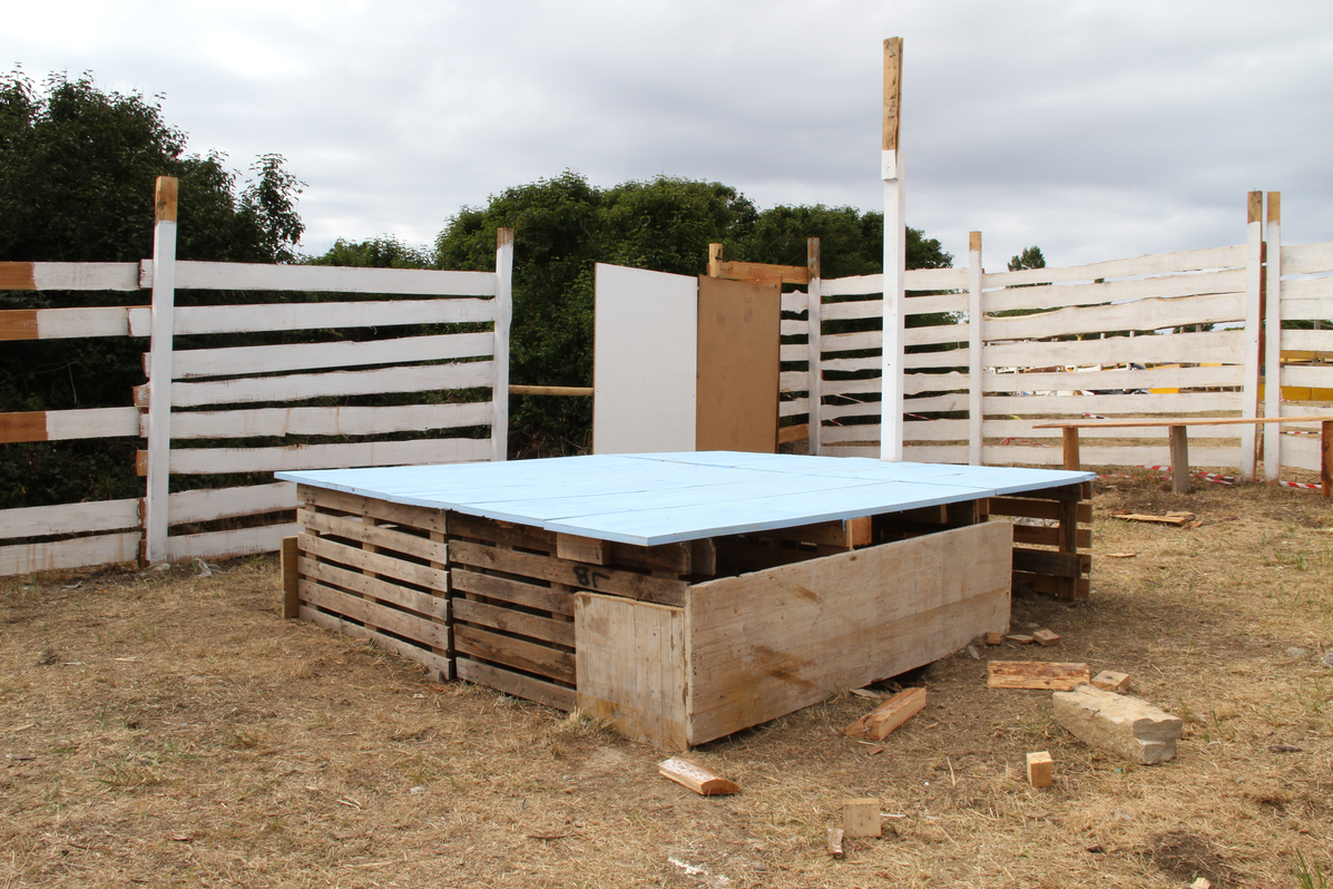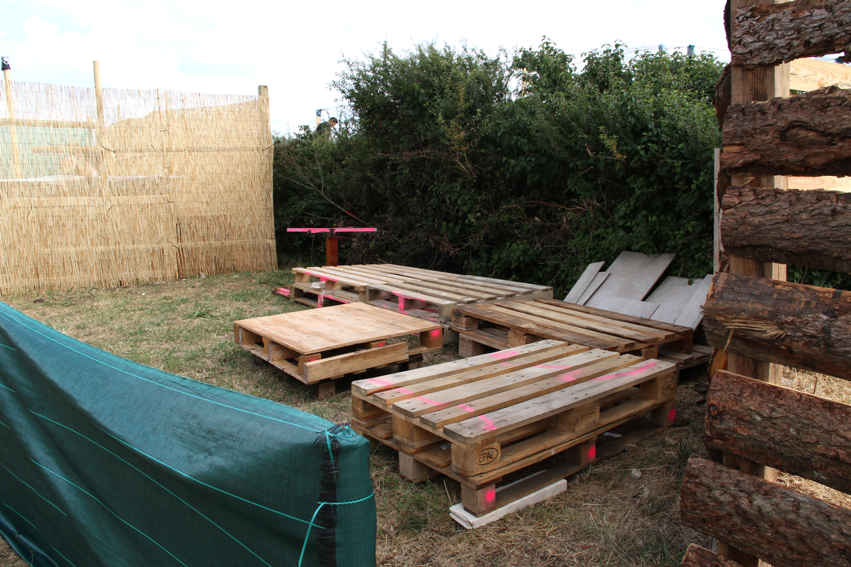 Building up. Building the stand is the hardest task when setting up the space. The simplest structure is typically a plastic gazebo, which comes with its own instructions. Some of these have plastic walls, others not. Sometimes grid-type walls are built using rope and ferns. Often the shelter is made out of building pallets, wooden rafters , and cork boarding. Once the main structure is built, furniture is brought in. The larger groups normally have a table and wooden benches. Sunshades are a regular feature. Mats are often used as beds. The stalls are very often decorated with flags, flowers, and even painted rafters or corner posts.