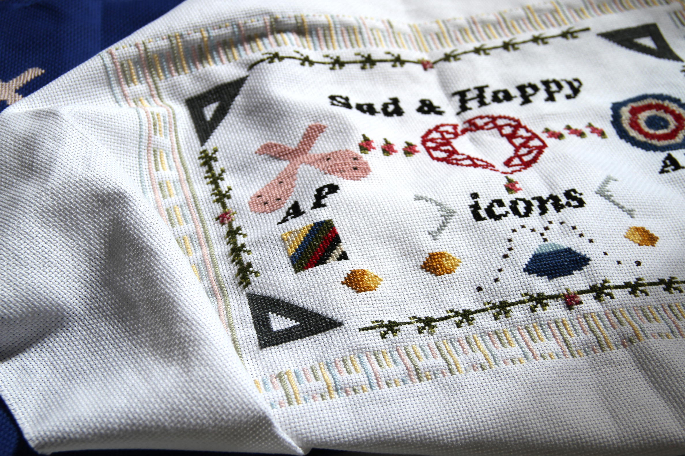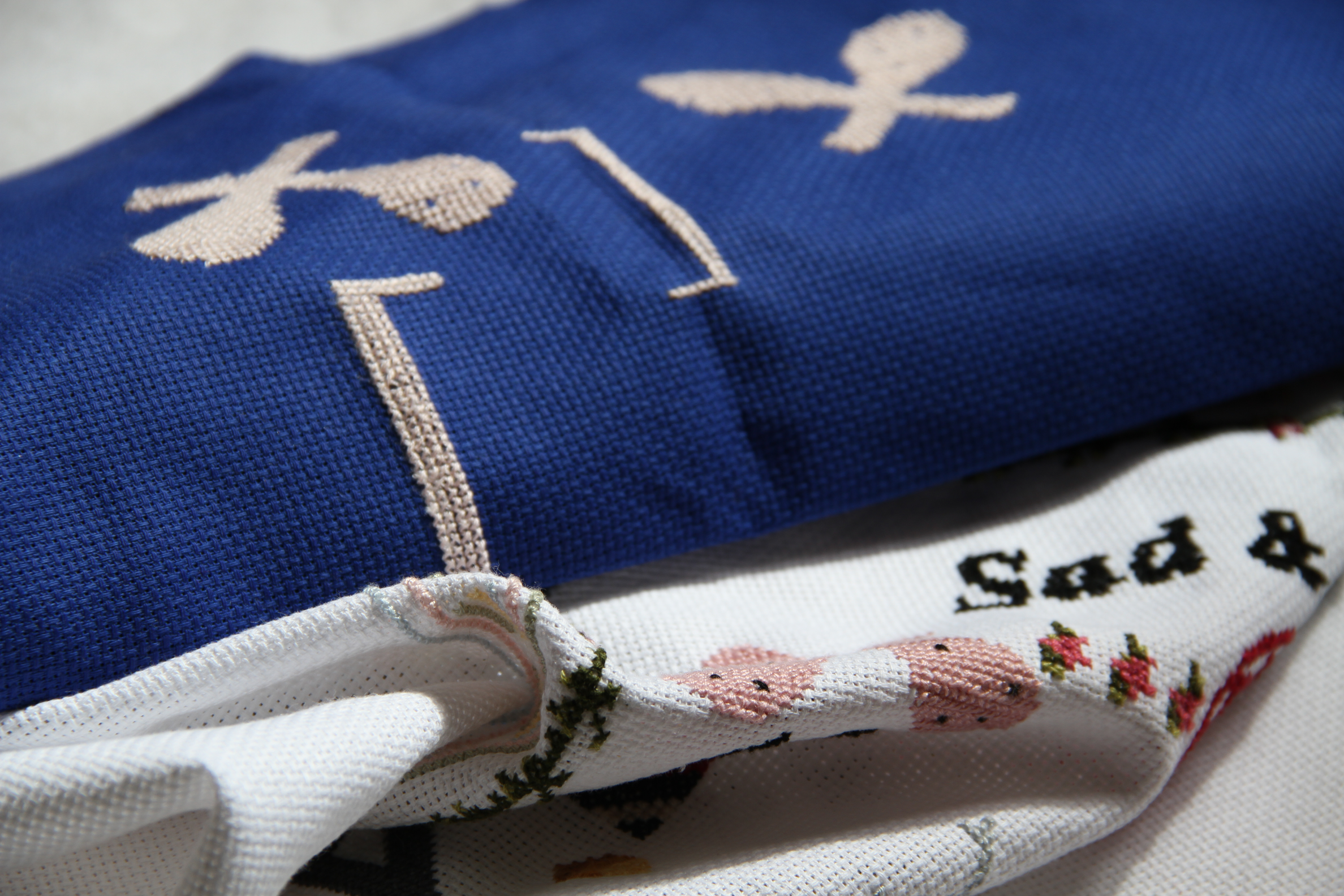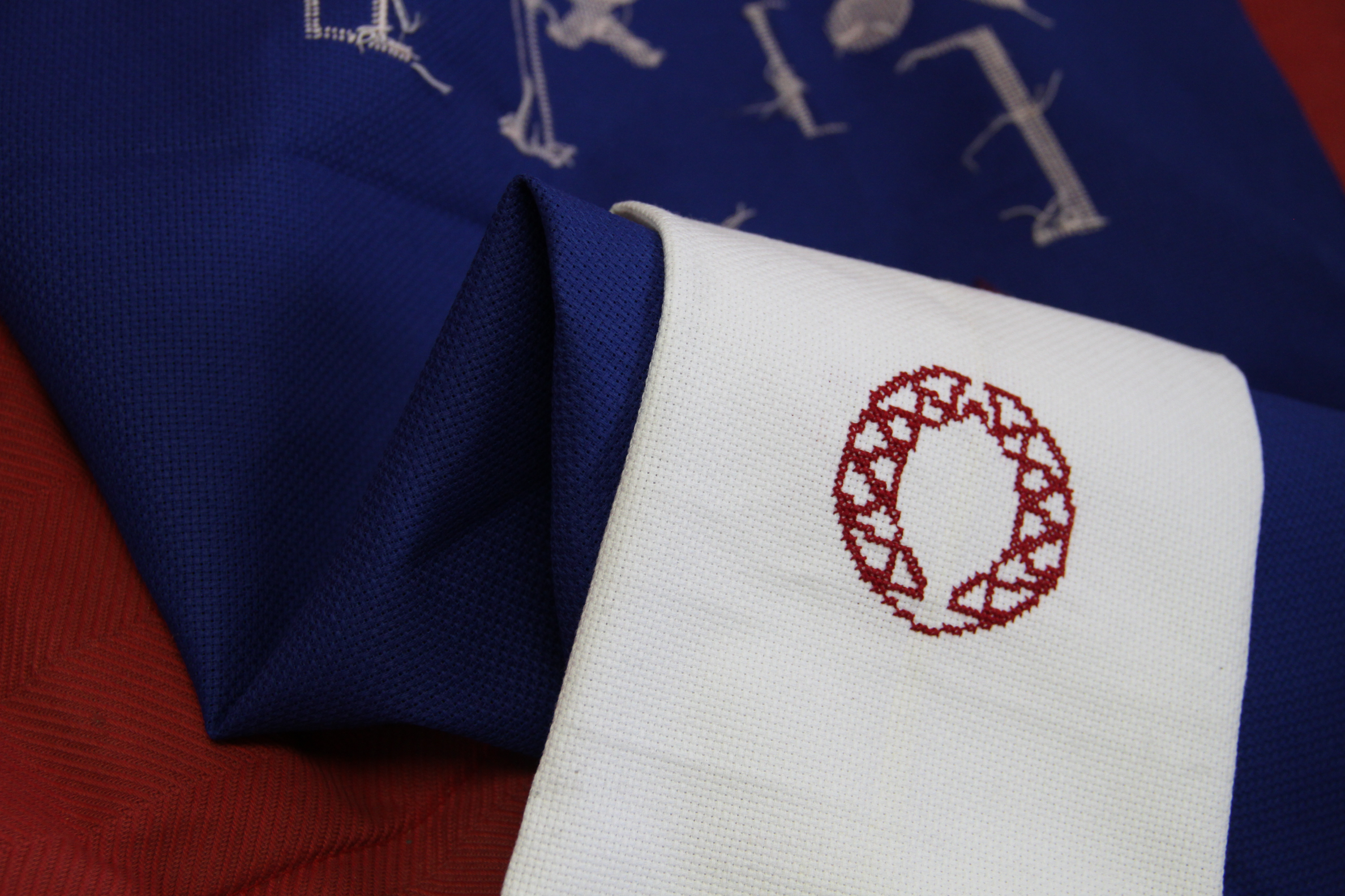 The symbol the movement of braiding gives rise to is materialised alongside graphic representations of square brackets and sports rackets in different media, particularly embroidery. This section shows photographs and sketches of this material, and images of a large piece of embroidery made in the La Ribera Market in Bilbao in 2018 (Home style).