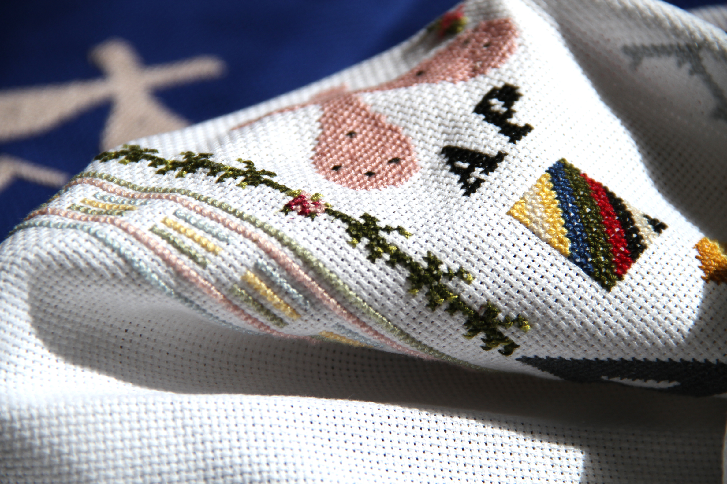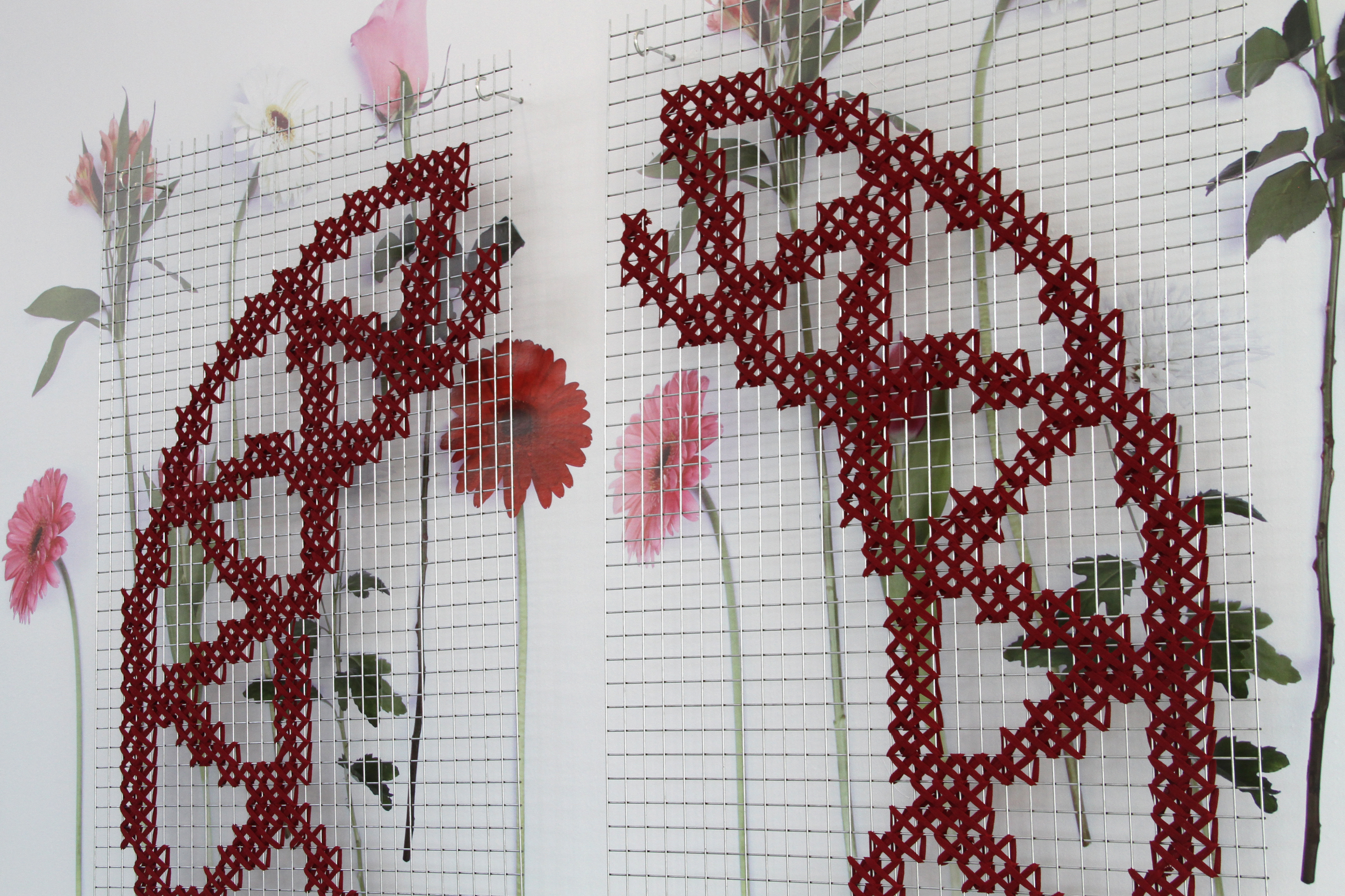 The following materials are used for this: a piece of vinyl with images of flowers which belonged to a branch stuck to the wall, and cross-stitch embroidery in wool on a wire mesh background.