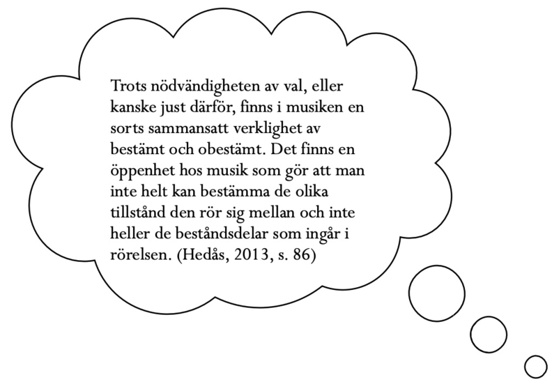 Vad är det som bestämmer vilka val jag gör när jag komponerar? Är jag alltid medveten om att det just är ett val jag gör när jag gör det? Troligtvis inte och den typen av strukturerad medvetenhet tror jag inte alltid är gynnsam för alla faser i den konstnärliga processen. Det som för andra kan tyckas vara ett val är för mig ofta en känsla, en impuls. Ett behov av att göra på ett visst sätt (förlänga en ton, justera tonhöjd eller dynamik) eftersom det inte kan vara på något annat sätt. De gånger jag har emotstått impulsen/känslan/behovet har det medfört en onaturlig distans till musiken. En känsla av att ha skapat något icke autentiskt som jag inte vill kännas vid. Musikalisk dissociation?