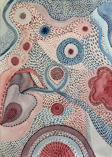 En första pianoimprovisation till målning 2. Jag inspirerades av den rödaktiga spiralen i mitten av målningen. En mittpunkt som expanderar. Jag spelade två närliggande toner och lät vardera hand vandra åt separata håll. Jag improviserade med tonmaterial och hittade ett rytmiskt mönster som tilltalade mig. Flödande och lekfullt. (Loggboksanteckning, 2025-02-19)