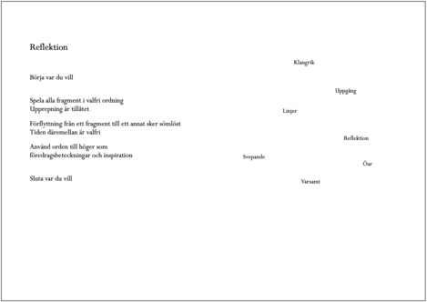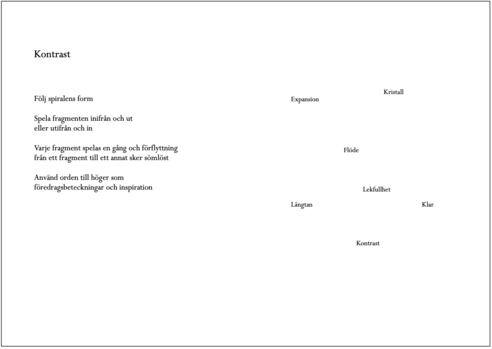 Förutom balans gällande ordval i försättsbladens instruktioner har jag eftersträvat balans gällande mängden information som förmedlas till musikern. Min strävan var att förmedla ett aleatoriskt förhållningssätt och samtidigt ge ”lagom” mycket information. Jag omsatte min strävan till en slags tydlig otydlighet i formgivningen av instruktionstexterna. Orden i ljudkartorna för respektive sats valde jag att inkludera i försättsbladen och låta det som har inspirerat mig i min process bli inspiration för musikern i dennes process.