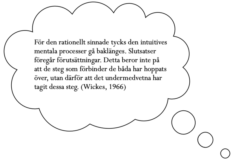 Anna Thorvaldsdottir (2008) skriver i sin uppsats om emotion och hur känslor motiverar kreatören till att göra vissa val. Hon skriver om hur det som jag beskriver som en självklarhet (stark intuition), snarare än val, i själva verket inte är så mystiskt och oförklarligt som det kan upplevas. Vi avväger och utvärderar utifrån det vi känner till och kan förnimma. Allt finns redan samlat inom individen och det enda kreatören behöver göra är att tillåta det att ta plats. Likt detta skriver Nachmanovitch (2010) i Spela fritt om intuition och vad intuition är: ”Det vi måste uttrycka finns redan i oss, vi är detta, så det skapande arbetet består inte i att få utsagan att framträda, men att undanröja hinder för dess naturliga flöde”.