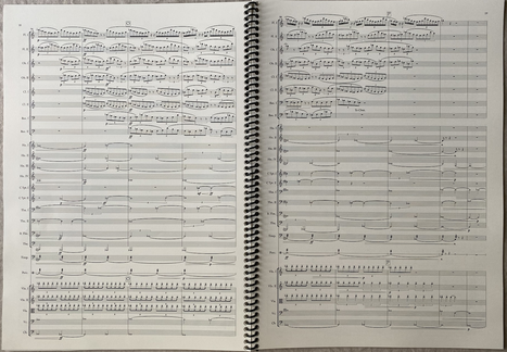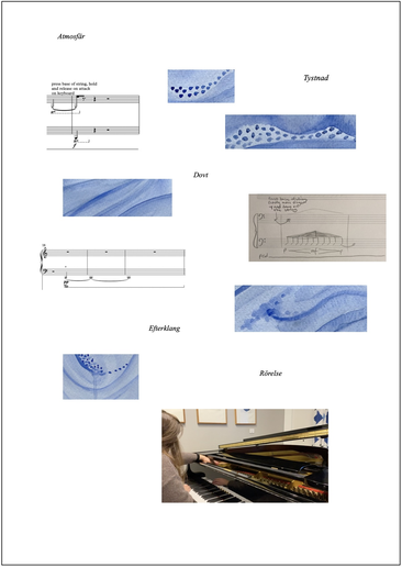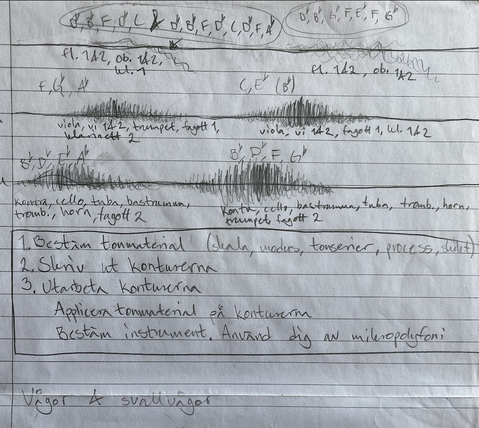 Jag läser, lyssnar, skriver och reflekterar jag. Jag söker mig tillbaka till tankar om stycket i början av processen och hittar två ord, vågor och svallvågor, antecknade i en av mina första skisser. Jag betraktar partituret och ser hur genomgående det konceptet är. Jag tänker att om jag spegelvänder klangerna innebär det att storformen av stycket blir just vågor och svallvågor. (Loggboksanteckning, 2024-11-21)