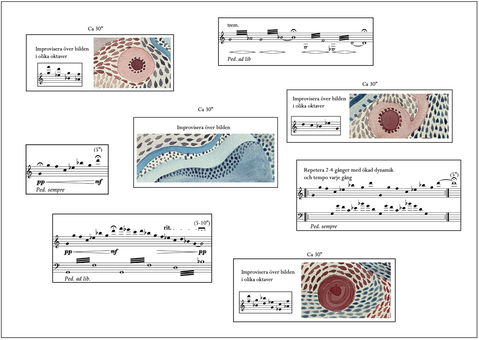 -Utkast till utformning av stycke. Skapa en skiss. Små urklipp från målning som kan improviseras över. Nyupptäckta ljud blandat med fragment ur improviserat material.