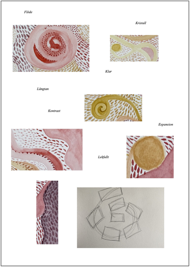 Målningarna tillsammans med fokusorden har varit vägledande under mina improvisationstillfällen på både konkreta och abstrakta sätt. Min blick har dragits till vissa former och gester i målningarna. Exempelvis i Kontrast där jag omedelbart började att arbeta utifrån målningens röda spiral som gav form åt styckets uppbyggnad. Linjer, prickar och fält av färg har jag på olika sätt omsatt till musikaliskt material. På ett mer abstrakt och övergripande sätt har de känslor som väckts i mig när jag betraktat målningarna omsatts till inre visualiseringar av musikalisk rörelse.