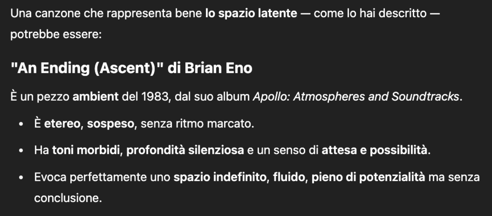 In questo scenario, lo spazio latente, inteso come luogo di ciò che può essere e dell’anticipazione, emerge come fulcro centrale e imprescindibile anche nel caso della mia ricerca. Uno spazio indefinito e creativo, dove un ascoltatore attento può intercettare conoscenze sottili e spesso sfuggenti.
