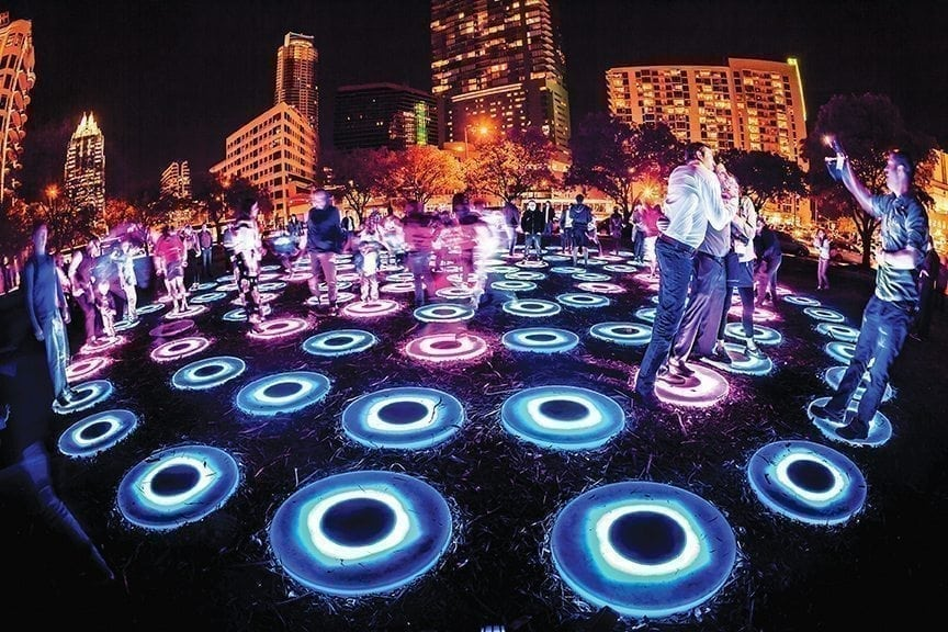 Myös esimerkiksi yhdysvaltalaisen taiteilijan Jen Lewinin valotaideteokset ovat tunnettuja niiden leikillisestä ja osallistavasta laadusta. Lewinin teokset kehottavat kokijaa kulkemaan, tanssimaan, hyppimään ja leikkimään teosten parissa, valon reagoiden näin kokijan tapaan olla teoksen äärellä. Innovation & Tech Today’n haastattelussa Lewin kertoo, kuinka muiden kokijoiden läsnäolon vaikutus, se kuinka teoksesta voi tulla myös yhteisöllinen kokemus, on hänen työskentelyssään merkityksellistä.