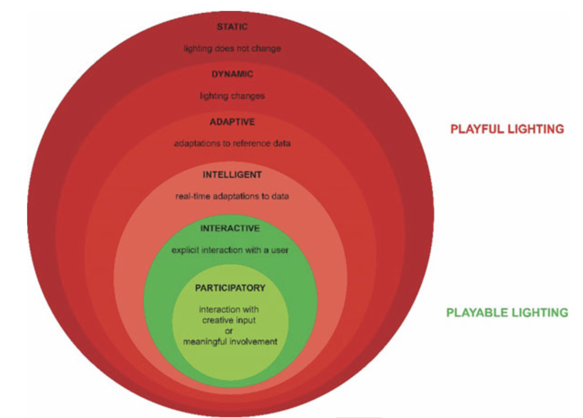 Tutkimukseni kokeellisessa osiossa pyrin tähtäämään kaavion keskiössä korostuvaan interaktiiviseen sekä erityisesti osallistavaan valon käyttöön, mahdollisimman leikillisten ja luovien tulosten sekä kokemusten saavuttamiseksi. Leikkisät lopputulemat eivät kuitenkaan välttämättä vaadi tietoista panosta ‘’leikkijältä’’, vaan leikkiminen voi olla myös alitajuntainen toiminto, jonka esimerkiksi juurikin ympäristö laukaisee.