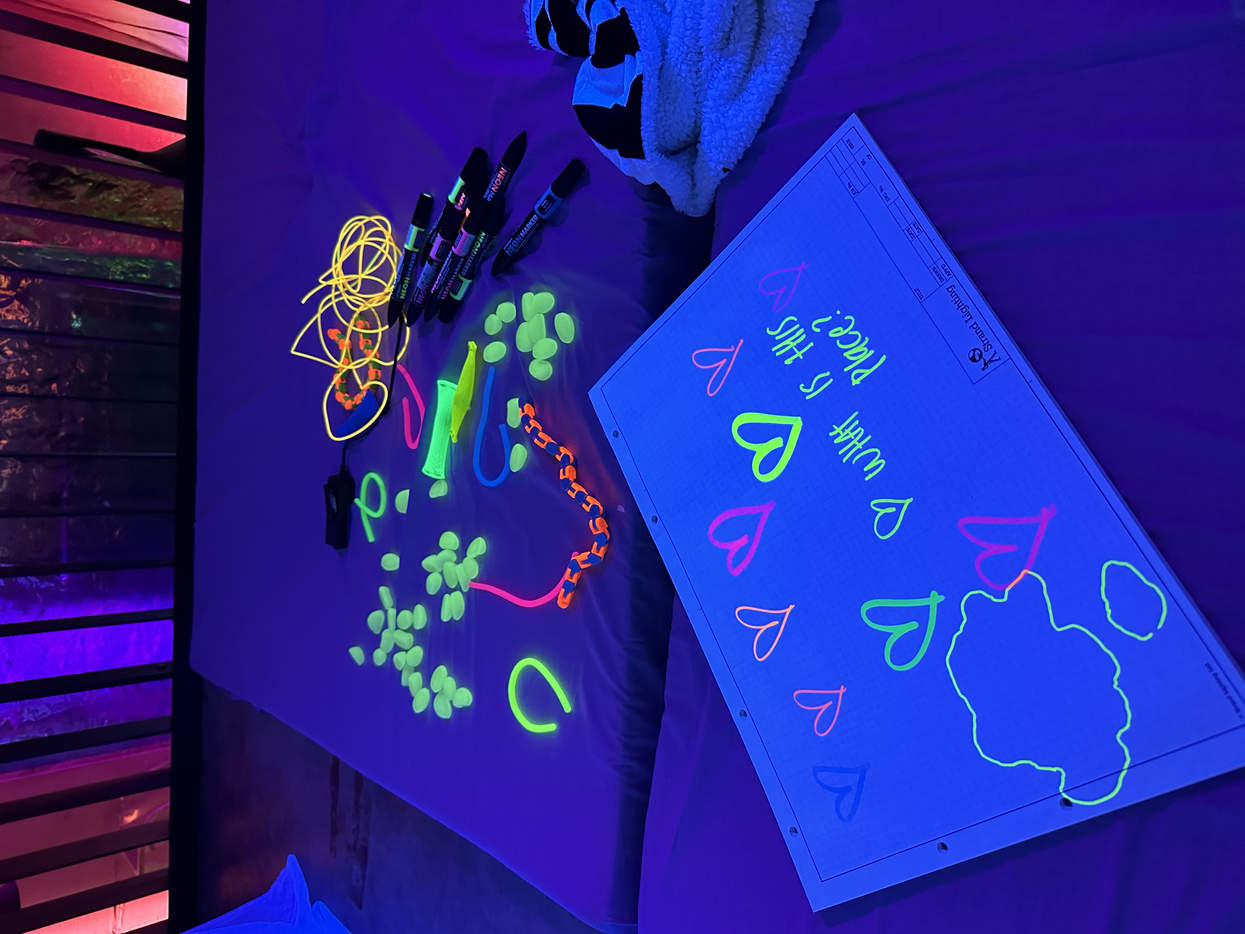 Täällä voit levätä, katsella vaihtuvia värejä ja kuvioita, makoilla ja hypistellä käsissäsi eri tuntuisia esineitä.