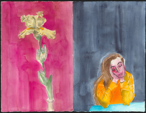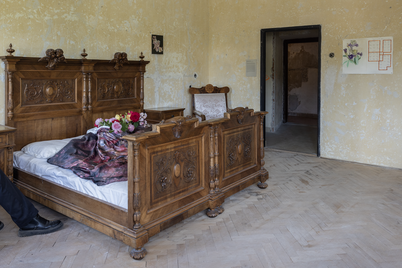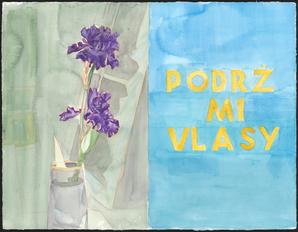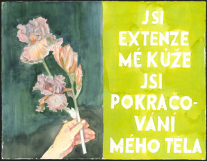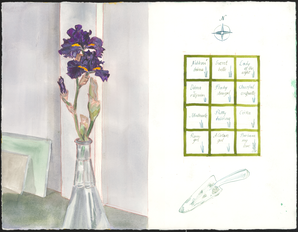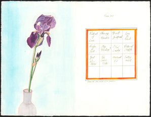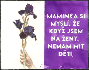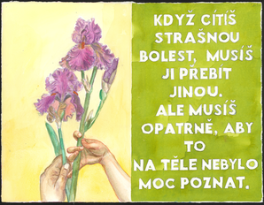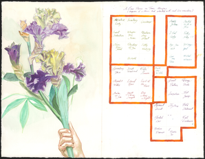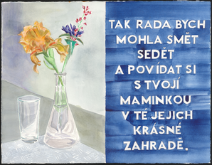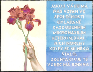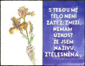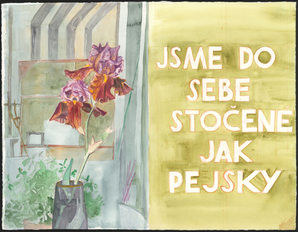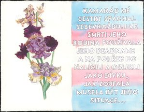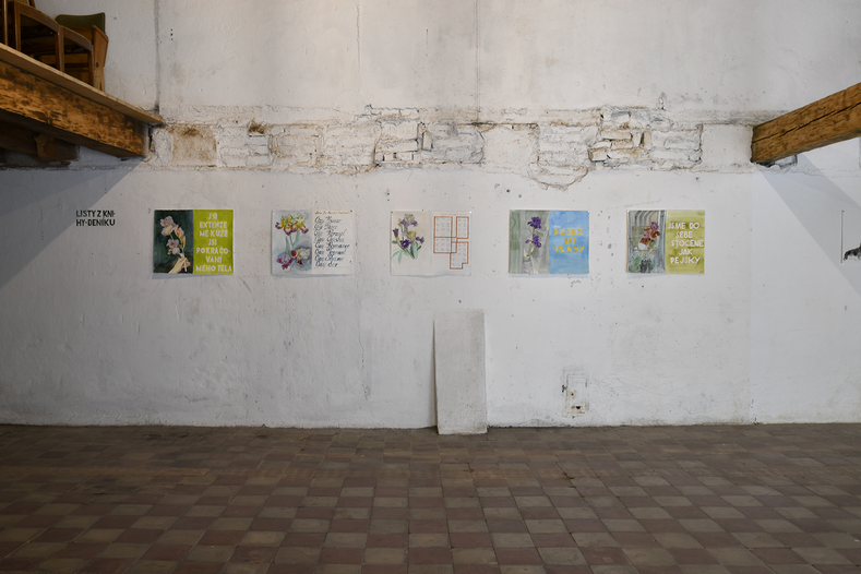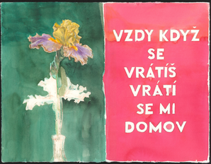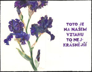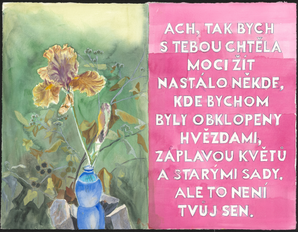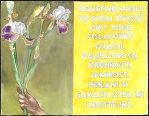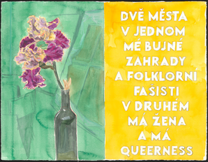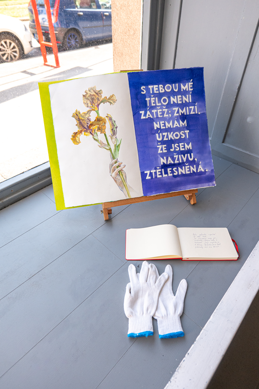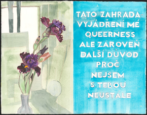 During the course of planting the first flower beds in the Rainbow Garden in Kameníky, I also started musing how I might connect the irises and desire on even more levels. Despite the fact that I made conceptual flower beds with irises because they provide the most versatile material thanks to the vast array of variety names, I cast my first sight on irises because I recollected my love for these flowers from earlier years. Initially, when I started expanding the guerilla garden around my studio, I only wanted to collect varieties that I swap with other local gardeners. As I became more curious and started doing research on iris collections, I gradually fell for them and they were becoming an obsession. One can say that the conceptual part of the planting that only developed later was a result of rationalizing and structuring this obsession. However, I was also musing how I can converse with the irises even on more levels, notably on the painterly one. Finally, the idea of a hand-painted book that would be a mix between a plant catalog, a guide through the garden, and a personal diary was born. Portraits of iris varieties would be complemented by maps of the garden beds and by a personal dimension of the queer motivation for the garden as a contrast to the more impersonal composition of the flower beds themselves. I decided that the beauty and fragility of the iris flowers could be complemented by dialogues between my partner and me which don’t necessarily always speak only about our relationship but also about the precarity of traumatized queer existence. The iterations express desire, anxieties, looking for home, belonging, recognition, and queer autonomy. They also speak about my relationship to the garden and how that relationship affects the relationship with my partner Tamara. In a silent nod to the 19th century popular culture phenomenon of “florigraphy,” gave the book the same name in Czech. The English title is Speaking Through Flowers: Or, Intimate Discourse From Lesbian Life and Several Gardens, through Irises. As of now, the book exists in one exemplar whose size and the fact that it must be only inspected while the reader has archivist gloves on lends it the air of a precious, middle-age-like manuscript.