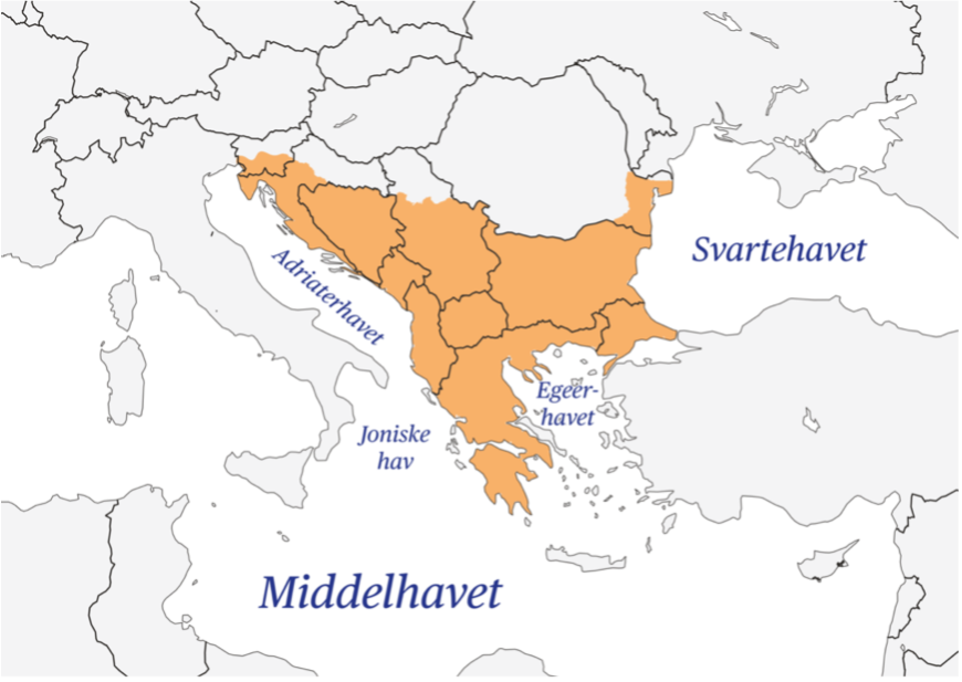 Figur 1. Balkanhalvøya markert i oransje farge. Fra «Balkan», av Store norske leksikon, 2025 https://snl.no/Balkan. CC BY NC 4.0