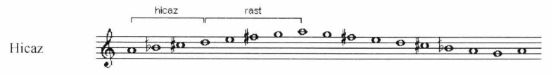 Figur 3. Hijaz skala som brukes av bulgarske musikere. Fra Harmony in Bulgarian Music (s. 39), av K. Kirilov, 2007, University of Oregon.