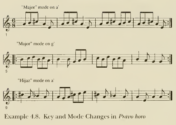 Figur 2. Skalaer og modi modulasjon i sangen Pravo Horo. Fra May it fill your soul: Experiencing Bulgarian Music (s. 76), av T. Rice, 1994, University of Chicago Press.