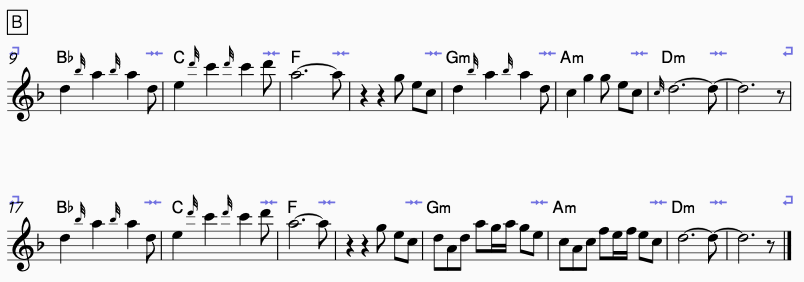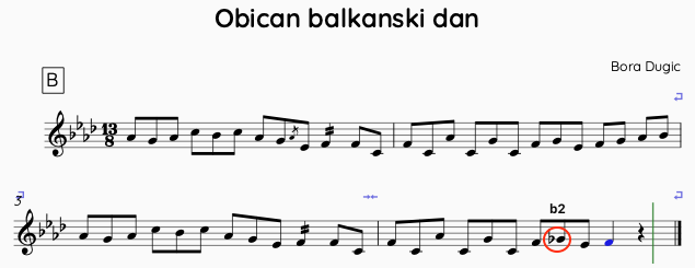 Melodi i B-delen er inspirert av pop, samt jugoslavisk rock. Med at den er inspirert av pop er det at den er lett å synge, samt huske. Den er altså motsetning til den ornament fylte A del tema. Her utnytter jeg ornamentering som jeg lærte av Jovan i en av timene fra desember 2024. Estetikkmessig velger jeg å ornamentere fram og tilbake med toner utenfor skala, samt ornamentere over-under før jeg går til tonen.