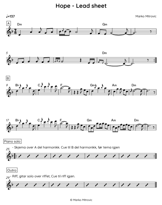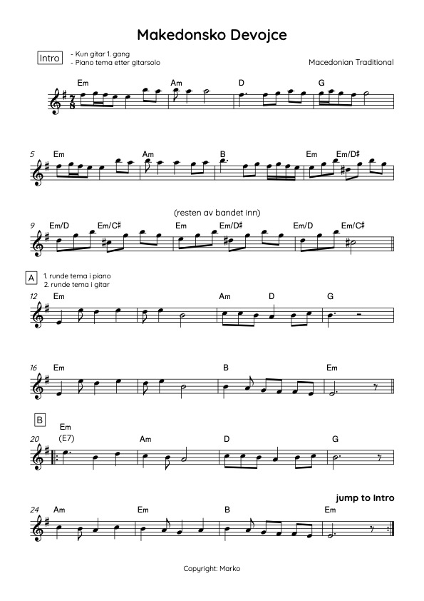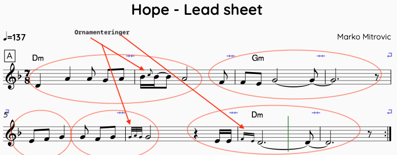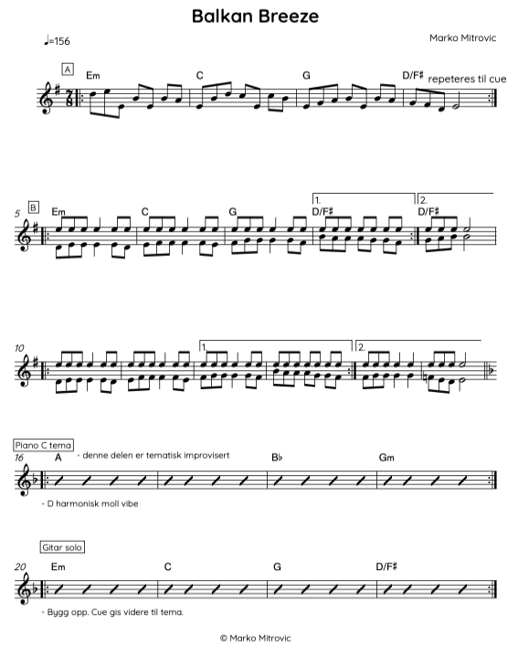 Både i A og B delen har jeg prøvd å legge til ornamenteringer. I motsetning til de andre komposisjonene hvor vi går ofte tilbake til B delen etter å ha spilt A2, har jeg lagd en C del med tema som leder i en bass solo seksjon. Bass tone du kommer til å høre i hele versjonen av sangen, har vært justert etter mitt valg om at den skulle ha fløytelignende lyd, men med mer edge (hvor bassisten bruker vreng og oktav pedal for å oppnå det).
