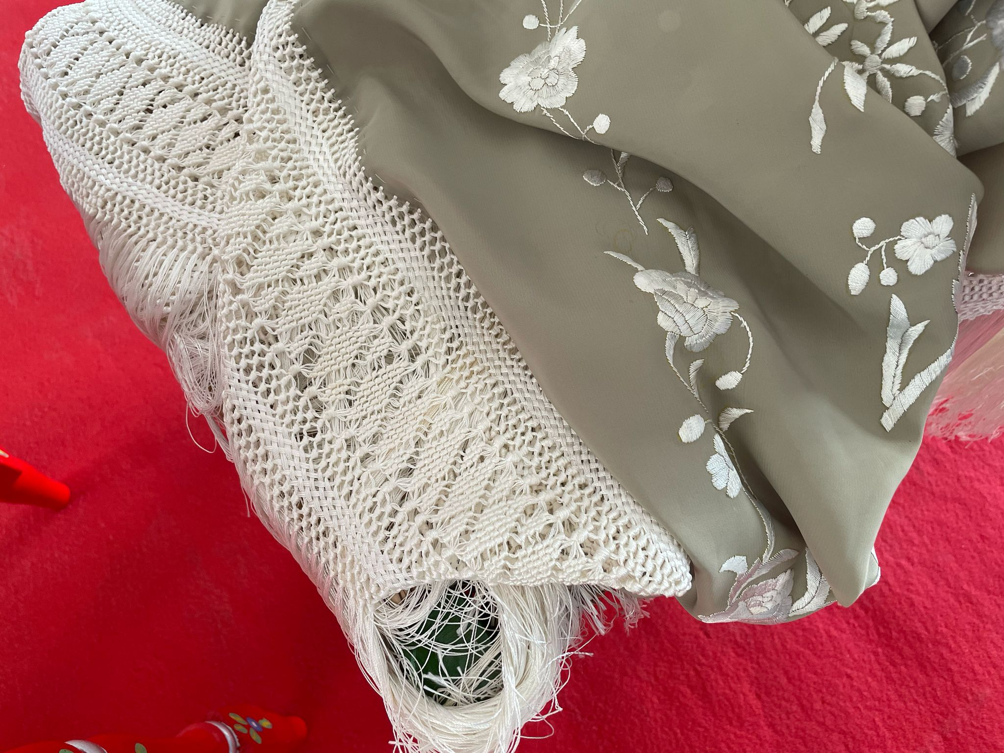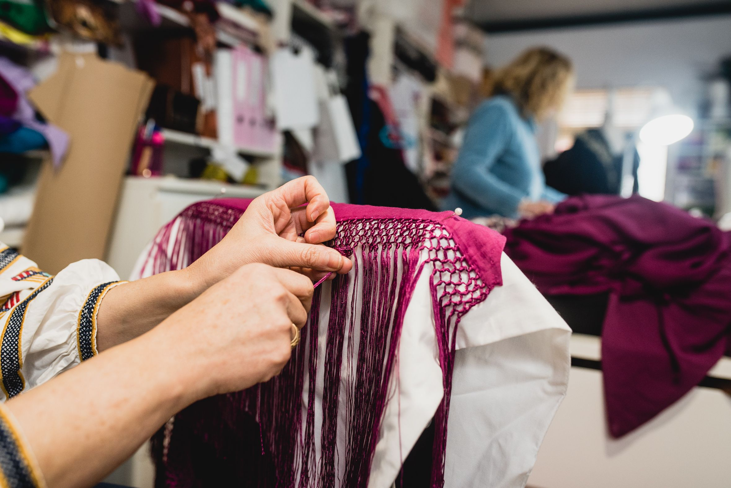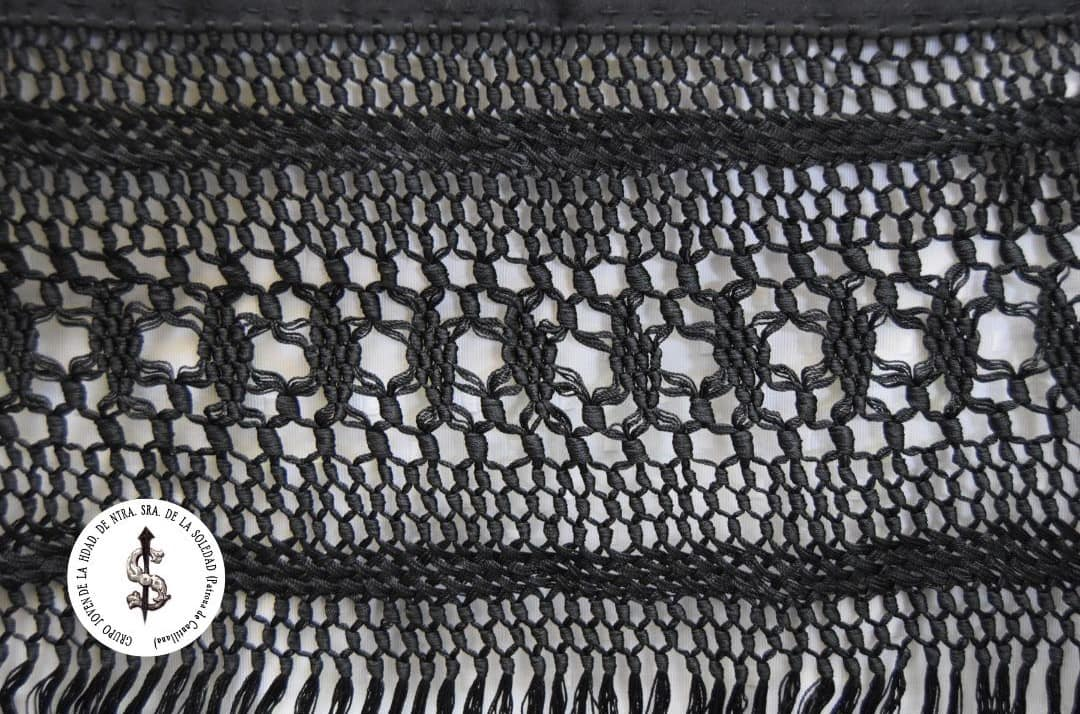 Beyond the immeasurable value of its hand-embroidered designs, the enrejado of the fringes adds another layer of craftsmanship. This intricate knotting technique, which finishes the edges of the mantón, originated in Cantillana, a tradition of which we are deeply proud. There are numerous variations of enrejado, but all follow an artisanal process that makes each piece unique. Factors such as the direction of the knots, the number of silk strands, and their precise placement contribute to an unparalleled craft, one that provides livelihood to many women in Cantillana.