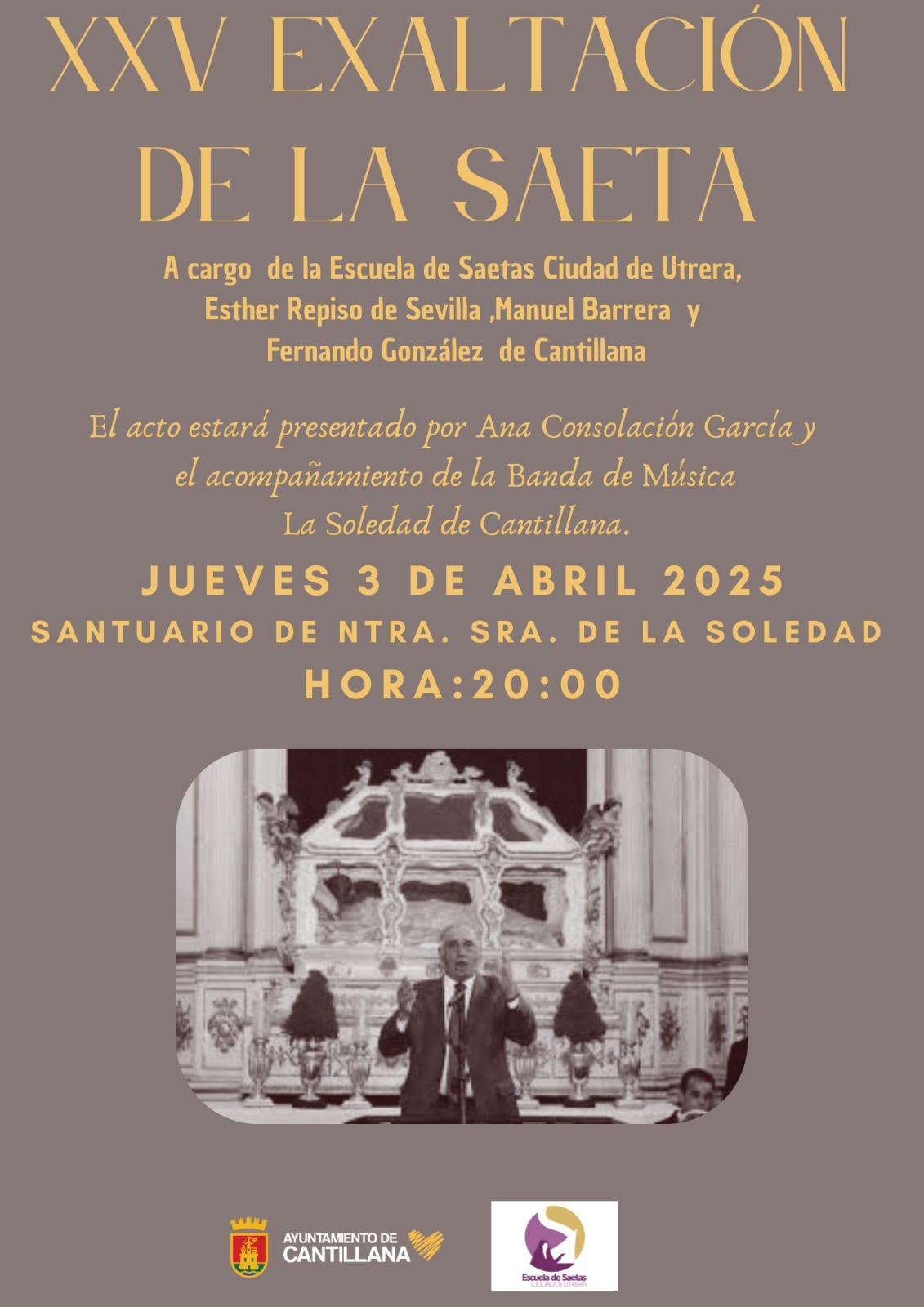 To foster appreciation for the saeta, enhance emotions during Cuaresma (Lent), and preserve this unique art form, Cantillana holds its annual Exaltation of the Saeta. During this event, an impassioned pregón (proclamation) serves as a guiding thread to introduce the saeteros and saeteras. A balcony railing is placed for them to lean on during their performances, reinforcing the traditional imagery of saeta singing. Additionally, this year marks the beginning of a new initiative—a saeta school aimed at passing down this art form to future generations.