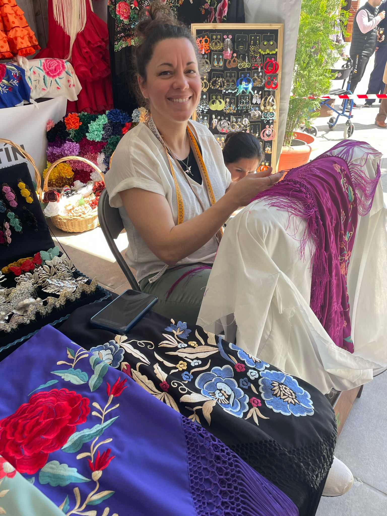 Today, it is common to see women taking their chairs out to patios or balconies or forming small groups of neighbors and friends who craft mantones while chatting. It is also frequent to see women collaborate in dressing their daughters for festivals—some sewing flamenco dresses, others working on the mantón, and others crafting accessories. This community-driven tradition turns a challenging circumstance into something social and joyful, woven into the fabric of everyday life in Cantillana.