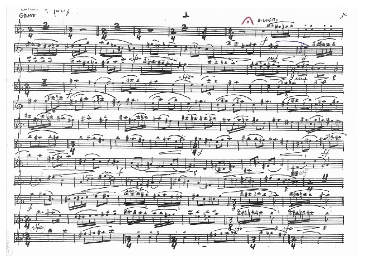 The narrowness of the staves made analysis and interpretation uncomfortable, while the annotations placed between the lines often got confused with those corresponding to the lines above or below. This lack of clarity in the overall design of the score further complicated the understanding of the piece, slowing my progress and making my practice less fluid. Despite these challenges, the process forced me to seek solutions and adjust my approach to move forward.