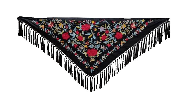 A mantón is a silk piece, either square or triangular, richly decorated in vibrant colors with natural motifs such as flowers, birds, or abstract patterns, and finished with fringes. I dare say that the image of an Andalusian woman is strongly associated with this accessory, just like flamenco. Worn over the shoulders, it is a highly valuable handcrafted piece, symbolizing elegance and cultural identity.