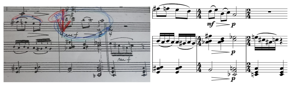 These errors included differing articulations, entire omitted sections, and discrepancies between the clarinet and piano parts regarding dynamics, character indications, and the organization of musical materials. After discussing this with the composer, he explained that he had composed the piece during a moment of inspiration, complete with the smudges, erasures, and corrections typical of such artistic processes. Later, one of his students created a clean copy and separated the parts, which likely introduced these mistakes.