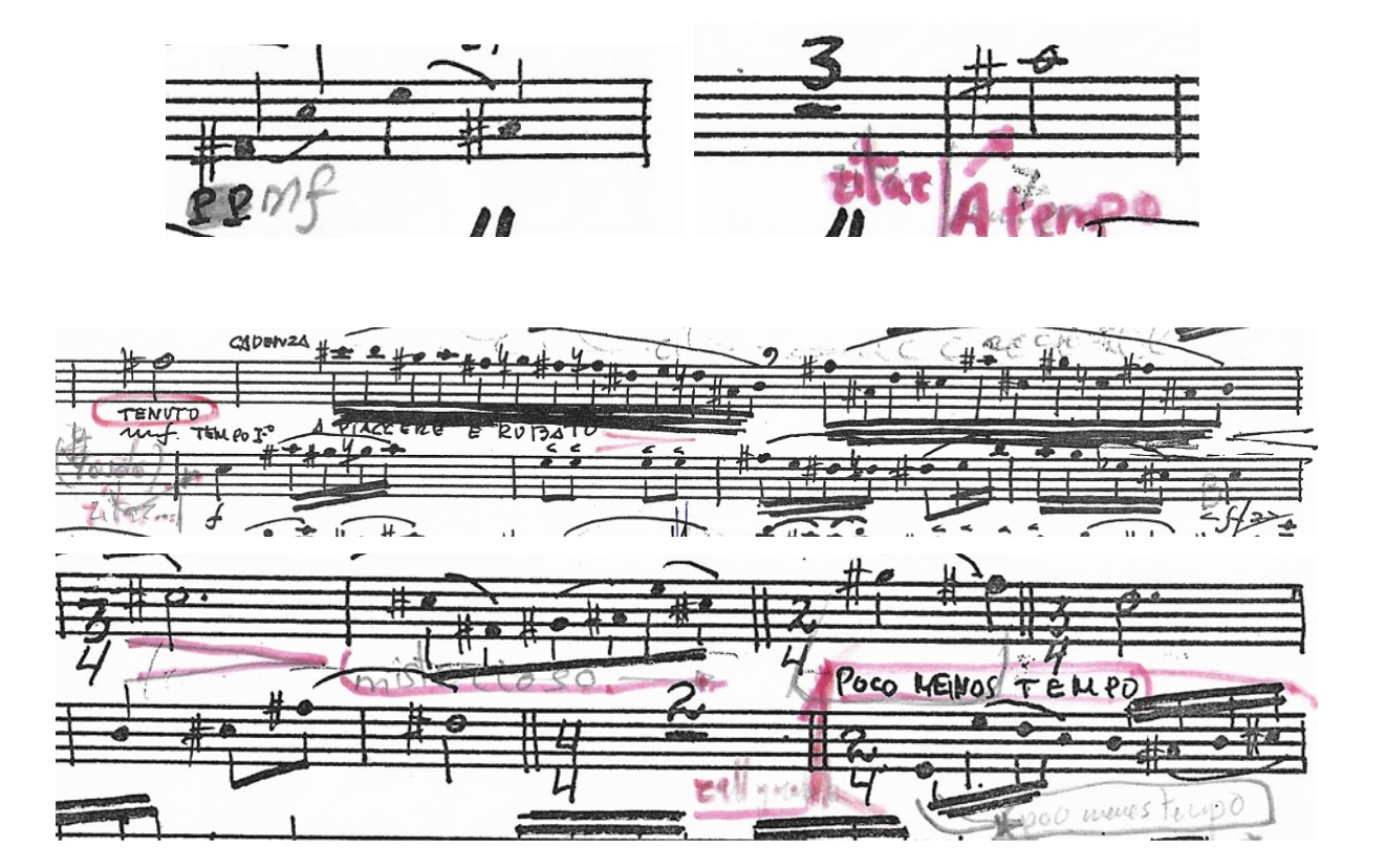 After a long process of reviewing and annotating the differences between the score and the parts, I scheduled a meeting with Antonio to decide on the final version of the piece. I took the opportunity to ask him some questions about whether the piece should include a key signature, how he envisioned certain passages, and how to interpret some tempo indications that were confusing. Antonio, in turn, used the opportunity to make small adjustments to the piece, consulting me to ensure that the changes were consistent with what felt most natural and organic to me as a performer.