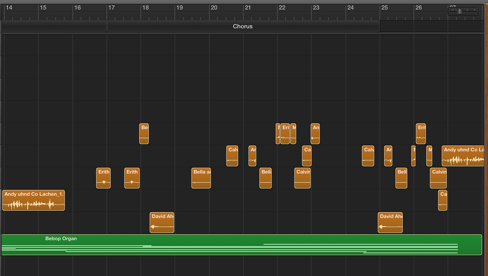 In preparation for Merlin’s second visit to Munich in December 2016 (after an initial preparatory week in March to brainstorm and develop the project and its methodology), Roesner clipped together a series of fillers with a primarily rhythmic intent, seeking out tonal contrasts. He began by arranging pauses and clusters, which then evolved into a beat. He was interested to explore how our perception of this montage might be steered in certain directions by underscoring it, tainting it, with four different basic musical structures. (See screenshot of GarageBand Arrangement.)